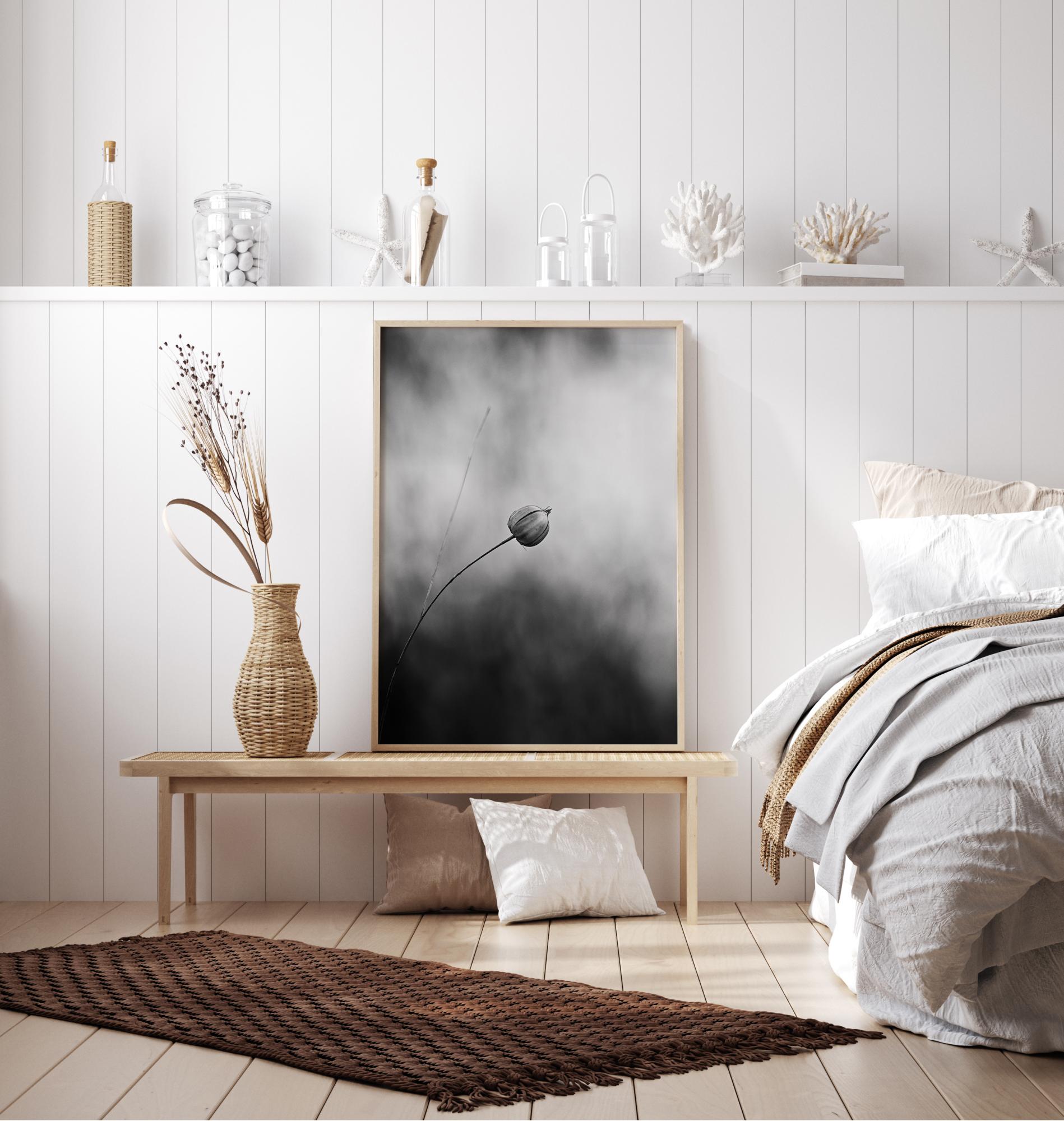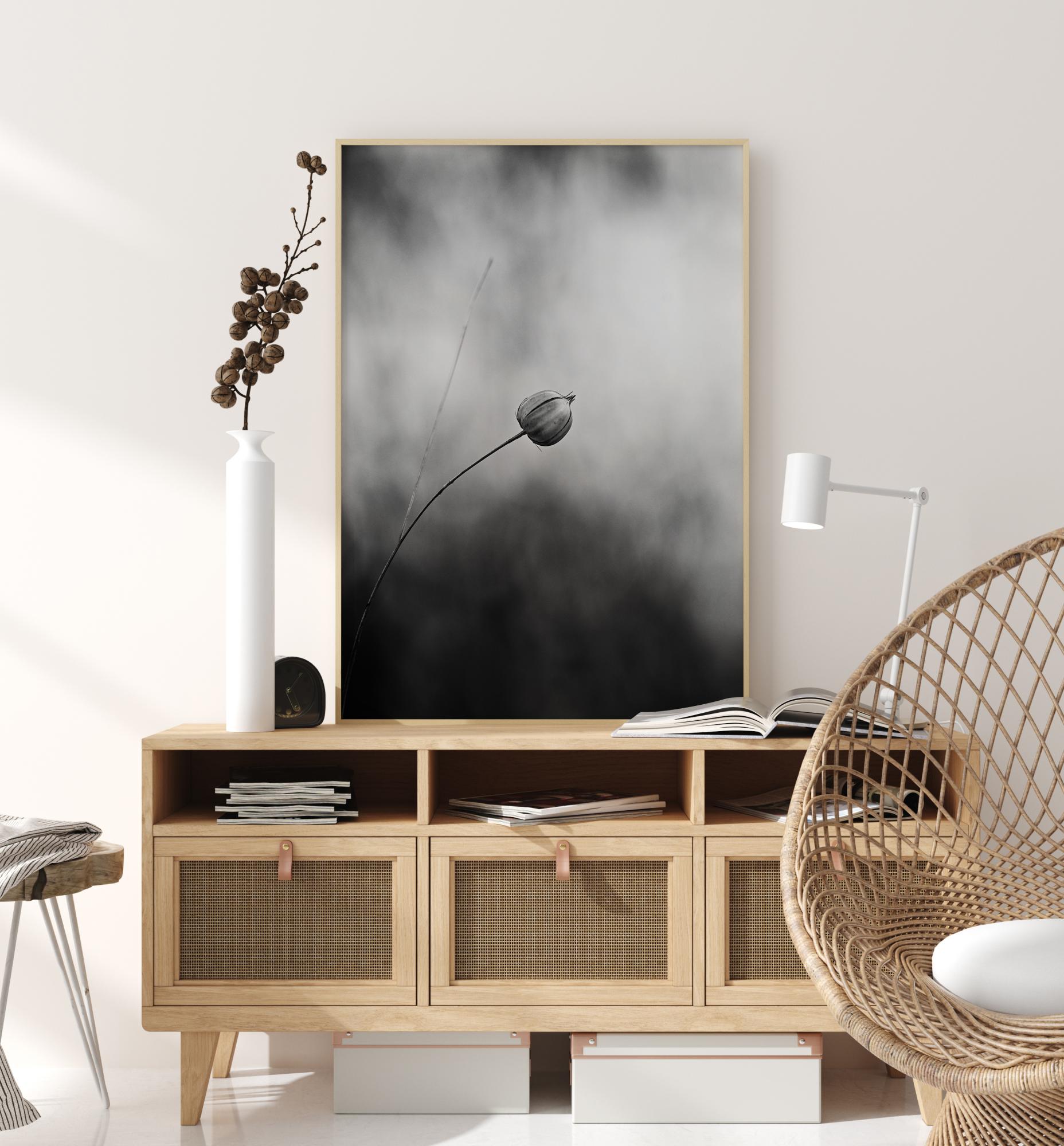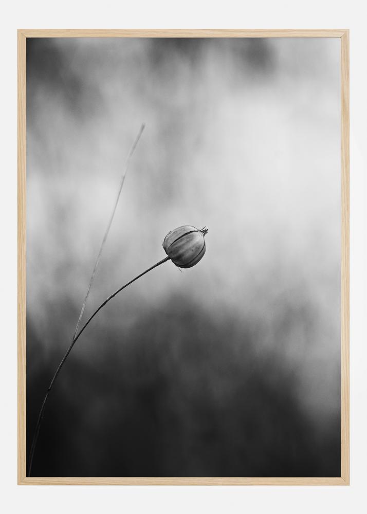 Egy fekete-fehér poszter egyetlen lenvirággal, miután az elvirágzott. A len középre hajlik a képen, és jól látható a fehér fény előtt. Az alján a háttér sötét és homályos, hogy a figyelmet az egyetlen virágra irányítsa. Adj ennek a műnek színt egy háttérfallal.