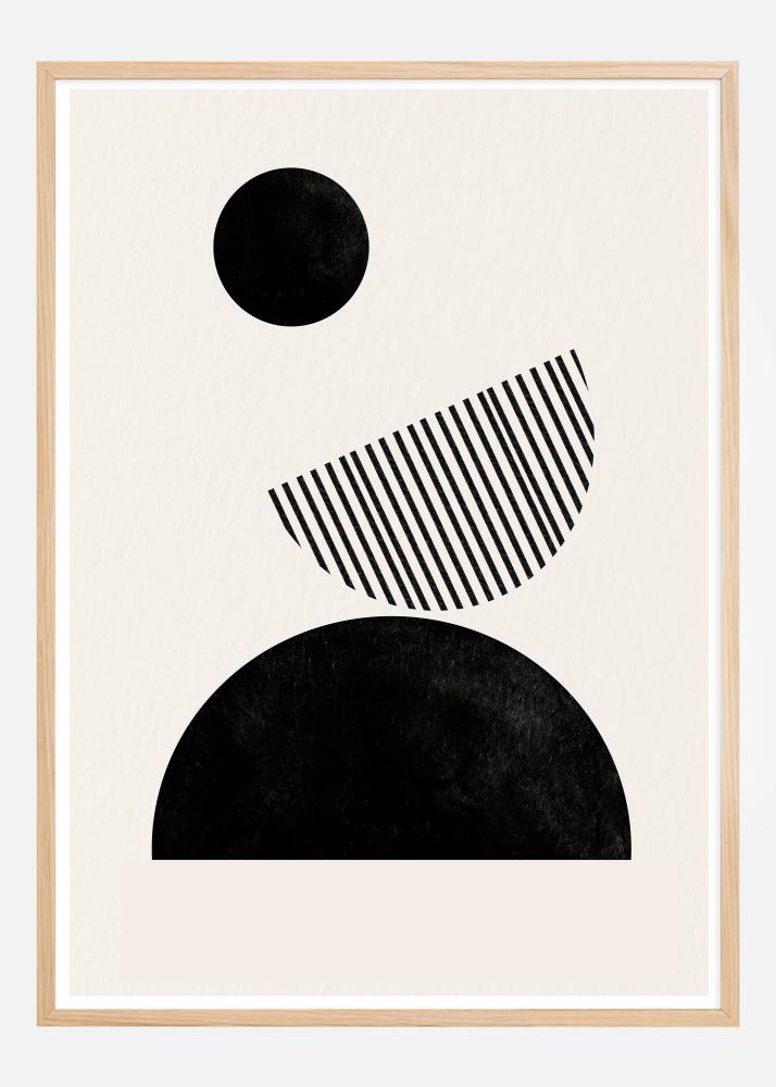 Ez a művészi poszter játékos használatával jellemzi a geometriai formákat és textúrákat, hogy egy kiegyensúlyozott és modern kompozíciót hozzon létre. Egy nagy fekete kör van a tetején, amelyet egy átlósan barázdált félkör követ, és egy szilárd fekete félkör alak a bázison. Minden elem hozzájárul a mozgás és a dinamika érzetéhez, miközben az egységes színösszeállítás összefüggés és egyszerűség érzetet teremt.