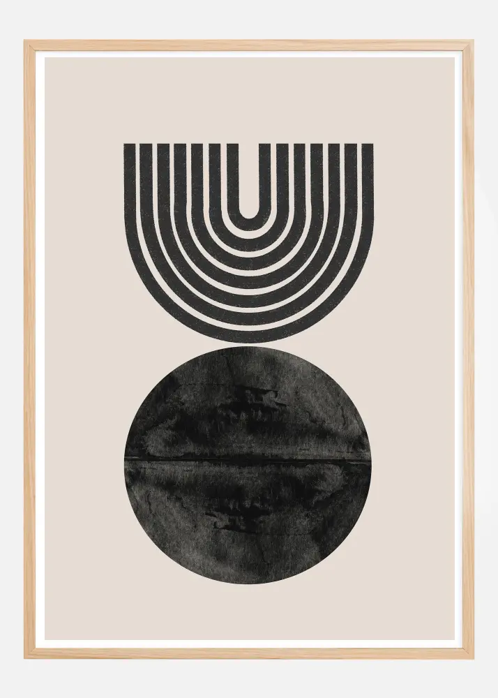 Ez a művészi poszter merész kontrasztjával és lenyűgöző kompozíciójával vonzza a szemet, amely geometriai és organikus formákból áll. Felül egy sor fekete vonal tűnik fel, amelyek félkör alakot alkotnak, erős vizuális struktúrát adva a nyugodt, semleges háttérhez. Alul egy texturált fekete kör látható, amely a vízbe való tükröződést idézi, mély és titokzatos minőséget adva a designnak. A kiválasztott fekete és törtfehér színek időtlen palettát hoznak létre, amely számos különböző ízlést és belsőépítészeti stílust vonz.
