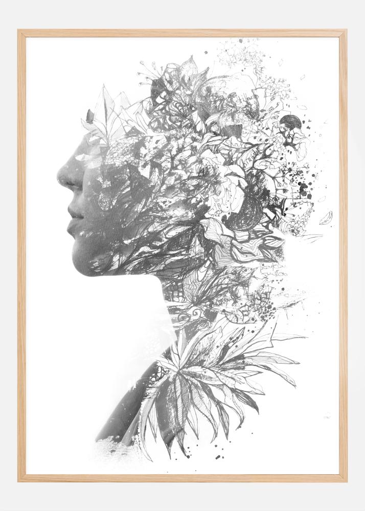 Ez a művészi poszter egy nő profilját ötvözi virágok és növények részletes és bonyolult illusztrációjával, ami egy lenyűgöző fúziót hoz létre az emberi alak és a természet finom részletei között. A fekete-fehér színséma időtlen érzetet ad, és kiemeli az emberi alak és a virágos motívumok finom textúráját és összetettségét.