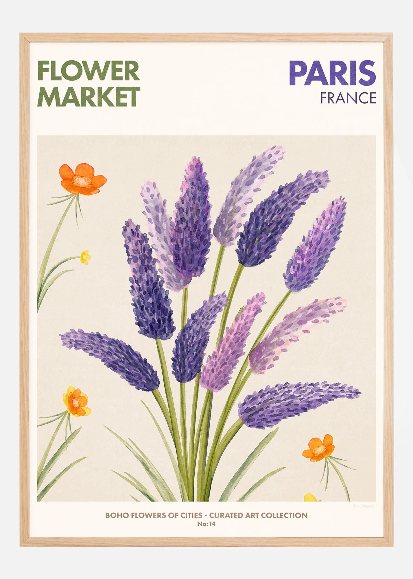Ez a nyomat világos és élénk színpalettával rendelkezik, amely magában foglalja a lila, narancs és zöld árnyalatait. A jellegzetes levendulavirágok uralják a kompozíciót a telített lilától a világosabb levendulalila tónusokig terjedő árnyalataikkal, kiegészítve narancsvörös és sárga virágokkal, amelyek plusz színfoltot adnak. Ez a poszter megragadja a néző tekintetét és egy örök tavasz érzését kelti, tökéletes azoknak, akik a természet szépségével és egy párizsi kaland érzésével bíró műalkotást keresnek.