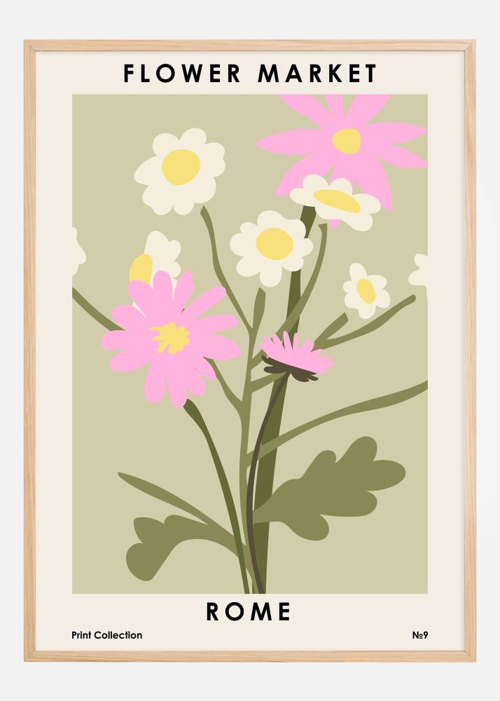 Világos és hívogató dizájnjával, ez a poszter Róma virágpiacának meleg és élénk atmoszféráját ábrázolja. A részletgazdagság és a színek játékos használata kerül előtérbe, nagy rózsaszín virágokkal, amelyeket finom fehér virágok egészítenek ki, mindezt egy megnyugtató olívazöld háttér előtt. Ez a nyomat tökéletes arra, hogy Róma örök városának érzését, valamint a szépség és a természet szeretetét hozza el a terébe.