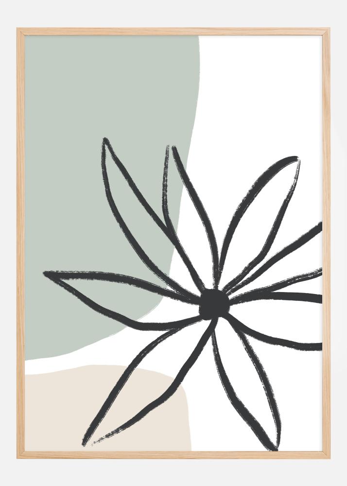 Ez a poszter, "Flower Mint and Cream", olyan egyszerűséget sugároz, amely egyszerre modern és időtlenül elegáns. A motívuma erőteljes fekete ecsetvonásokkal stilizált virágot ábrázol, amely megnyugtató mentazöld háttérrel kontrasztot teremt, amely egyszerre merész és kiegyensúlyozott. A kép alsó felét kitöltő krémes, semleges tónus lágy kontrasztot nyújt, amely kiegészíti a minimalista designt.