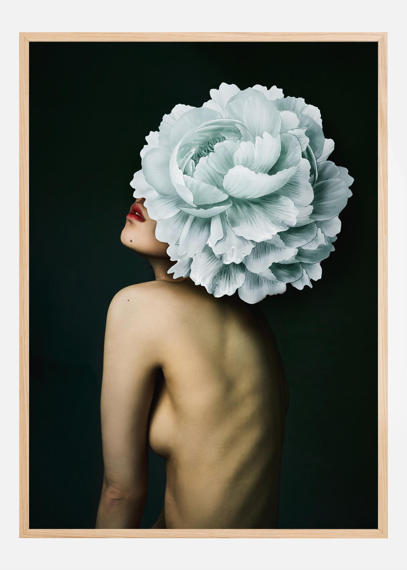 Ez a plakát egy lenyűgöző és művészi kompozíciót ábrázol, ahol az emberi szépség találkozik a természet csodáival. A kép hátulról mutat egy személyt, fejét egy pompás, szinte túlméretezett fehér virág helyettesíti. A puha bőr és a részletgazdag virág közötti kontraszt vizuális szimbiózist hoz létre, amely egyszerre álomszerű és ösztönző. A nyomat színsémája egyszerű, de erőteljes, árnyalatokat alkalmazva a fehérből, a bőrszínből és az ajkak mély vöröséből, egy sötét, szinte monokróm háttér előtt.