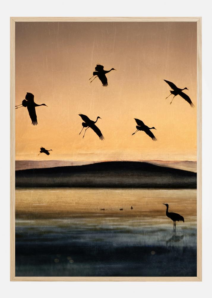 Egy hangulatos poszter madarakkal, akik naplementekor repülnek. Hat gólya indul el, sziluettjeik éles ellentétben állnak a narancssárga éggel és a lemenő nappal. Egy magányos madár áll a kék- és aranyszínű tóban, és felnéz a többiekre, amikor elrepülnek. Érezze a repülés nyugalmát ezen a meleg poszteren.