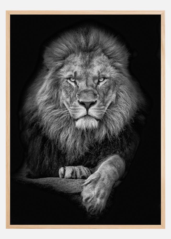 Egy fekete-fehér közeli fénykép egy oroszlánról, amely egyenesen a néző szemébe néz. A sötét háttér és az intenzív tekintet nagyszerű vonzerőt kölcsönöz a képnek. Ez egy olyan poszter, amely önmagában is megállja a helyét, de más kedvencekkel együtt egy nagyobb kollázs részeként is jól mutat.