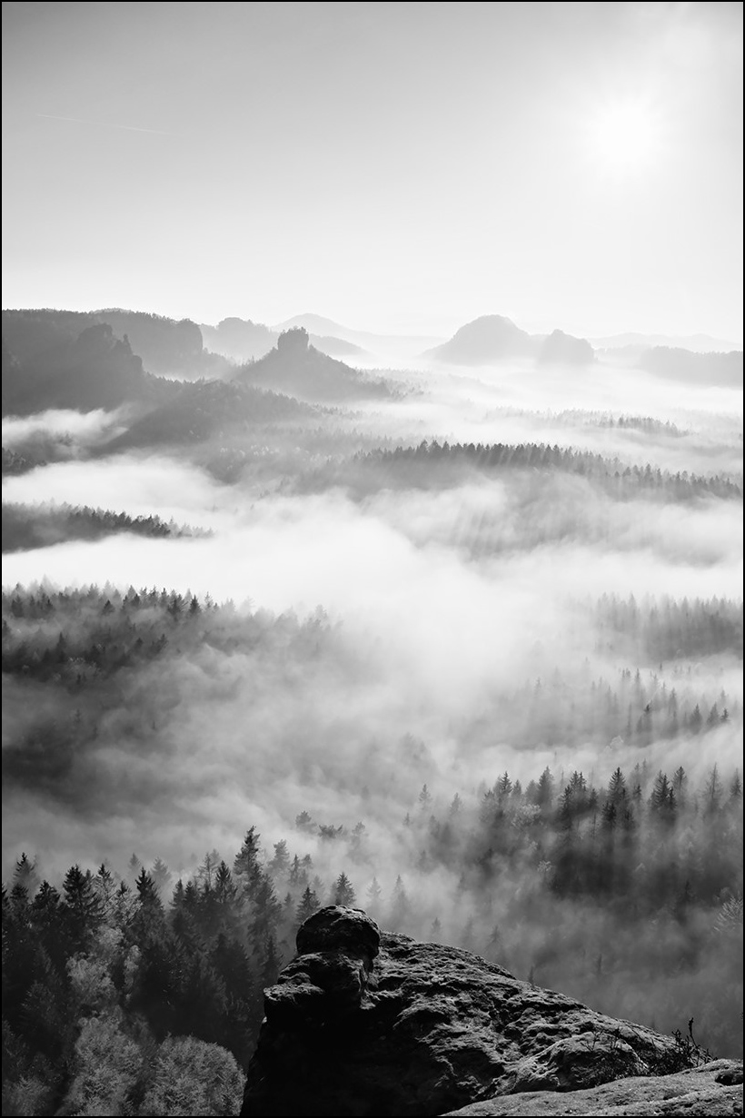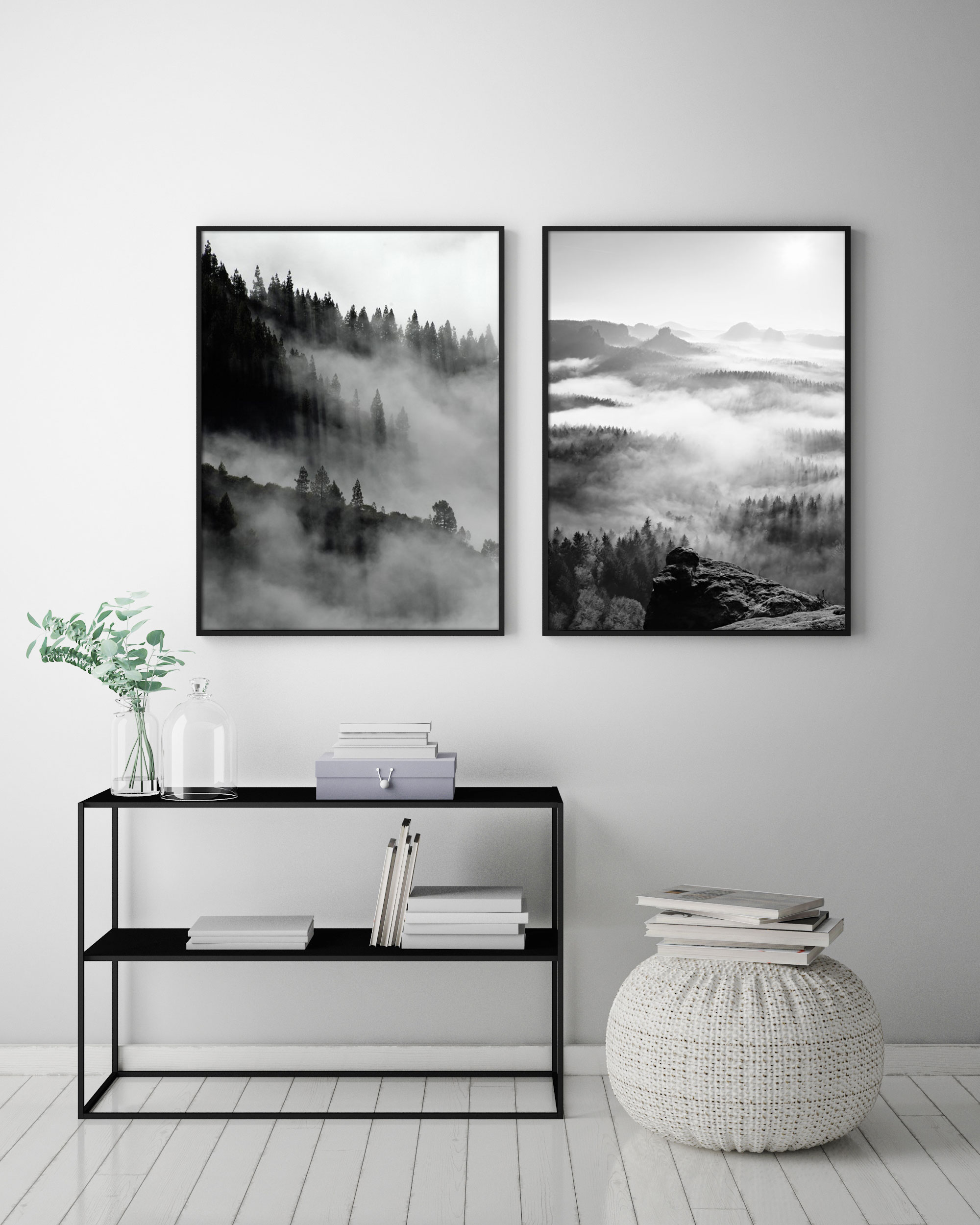 Fekete-fehér fotó fenyőfás hegyvidéki tájjal ködbe burkolózva mint motívum. A kép mély perspektívája, a fák fölötti magas nézőponttal, drámai érzést kölcsönöz a poszternek. A fénykép otthoni vagy nyilvános környezetben is jól mutat, bármilyen típusú lakberendezési stílusba illeszkedik. Egészítse ki egy csinos képkerettel, amely jól kiemeli a motívumot, és illik a szoba többi berendezéséhez, ahol a kép lesz felakasztva.