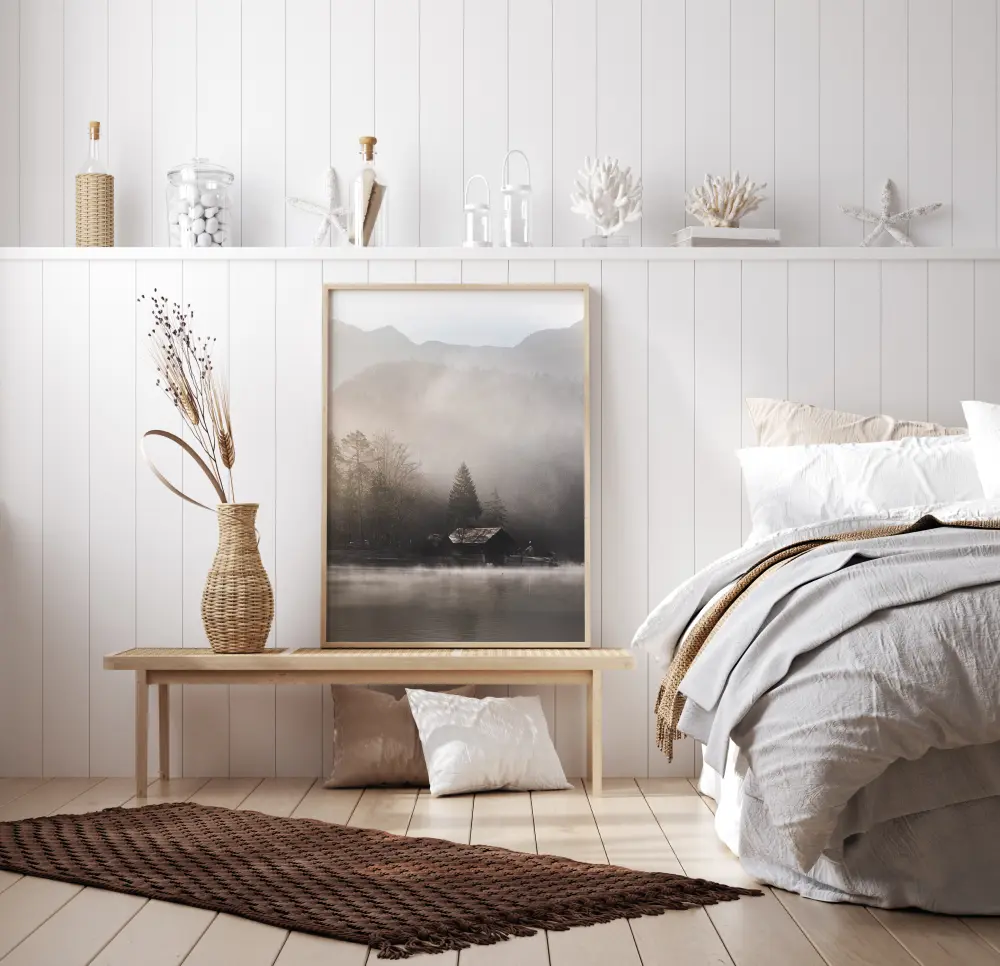 Egy kellemes poszter egy hegyi kunyhóval, amely egy ködös tó szélén található. Lágy pasztellszínek adnak ennek a képnek egy enyhe érzetet, ahol a korai reggeli napfény jobbról sugárzik, hogy felemelje a ködöt. Akaszd fel ezt egy egyszerű falra, és veszítsd el magad a magányos vadonban és ennek a hangulatos poszternek az egyszerűségében.