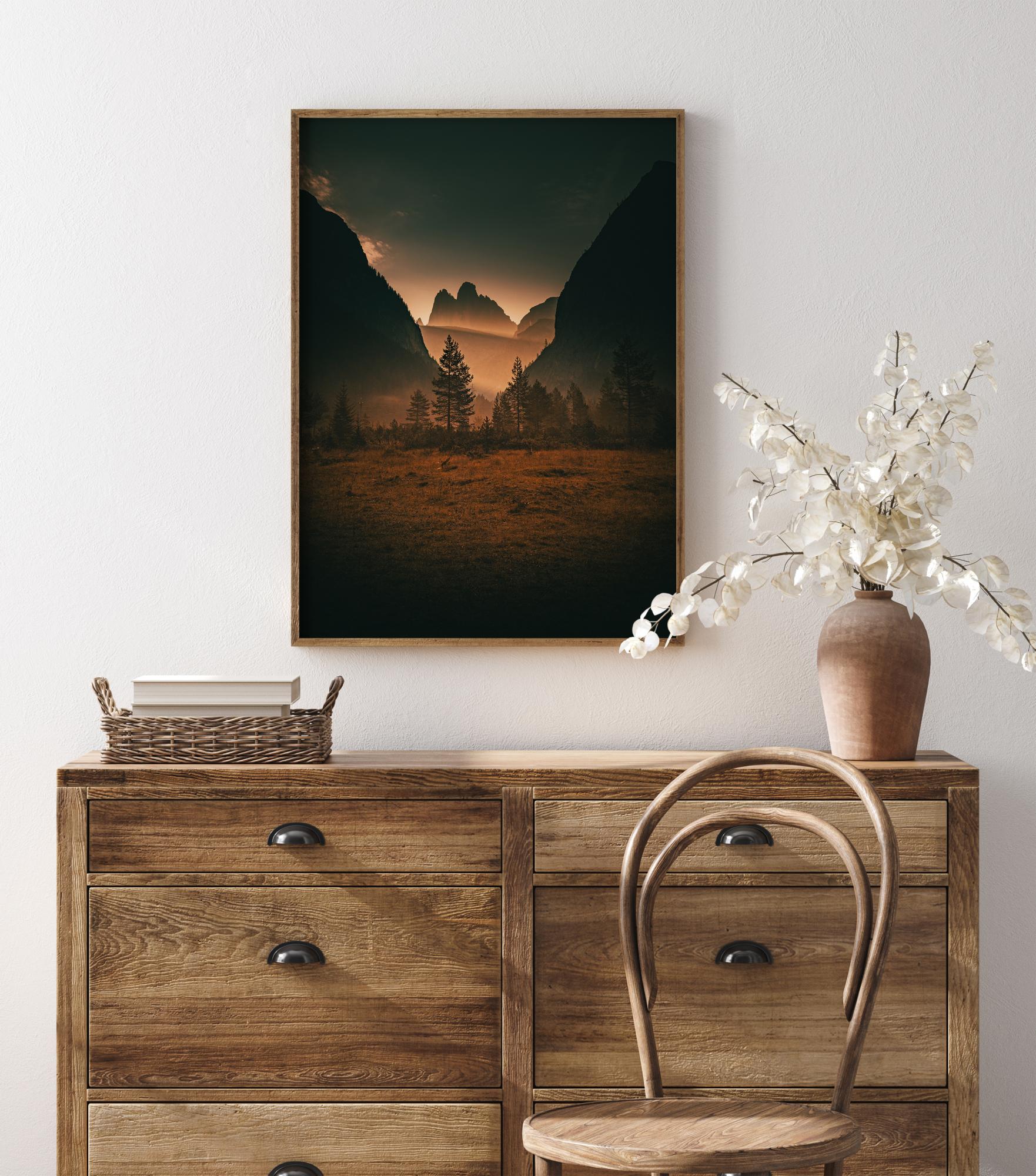 Egy lenyűgöző poszter egy drámai erdővel, ahol a nap lenyugszik. Egy mély narancssárga mező fenyőkkel a háttérben, amelyet két hegy övez, és egy völgyet alkot. Középen több hegy emelkedik, és a lenyugvó nap utolsó sugarai áttörnek, igazán epikus fantasy-hangulatot teremtve. Merülj el ebben a varázslatos világban.