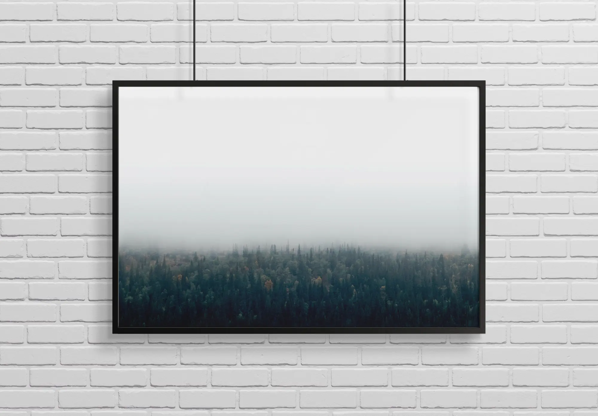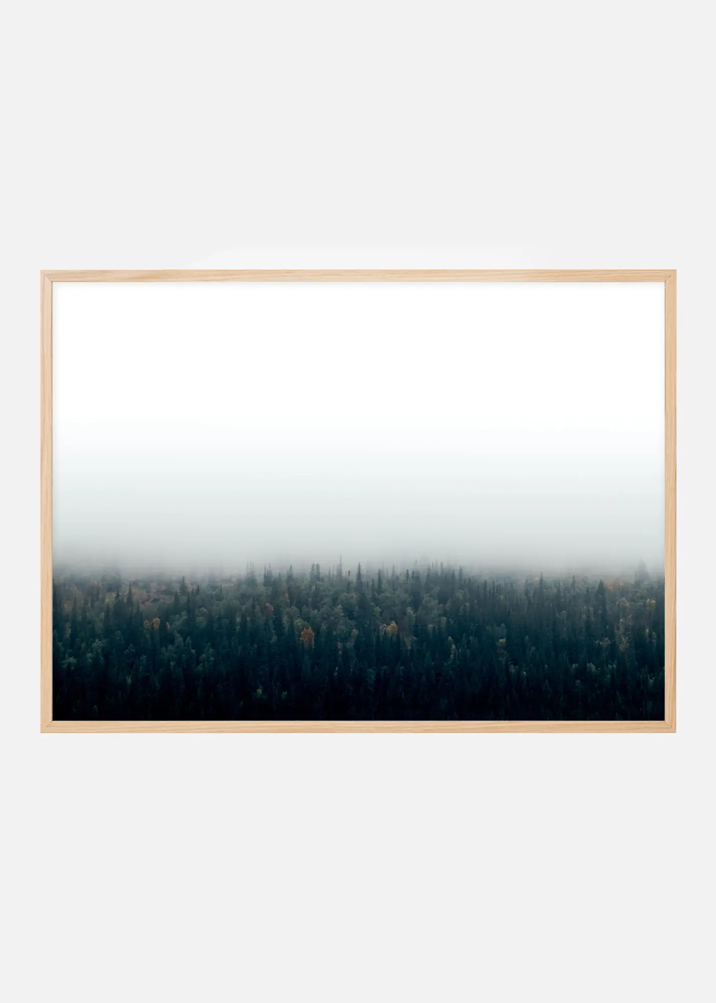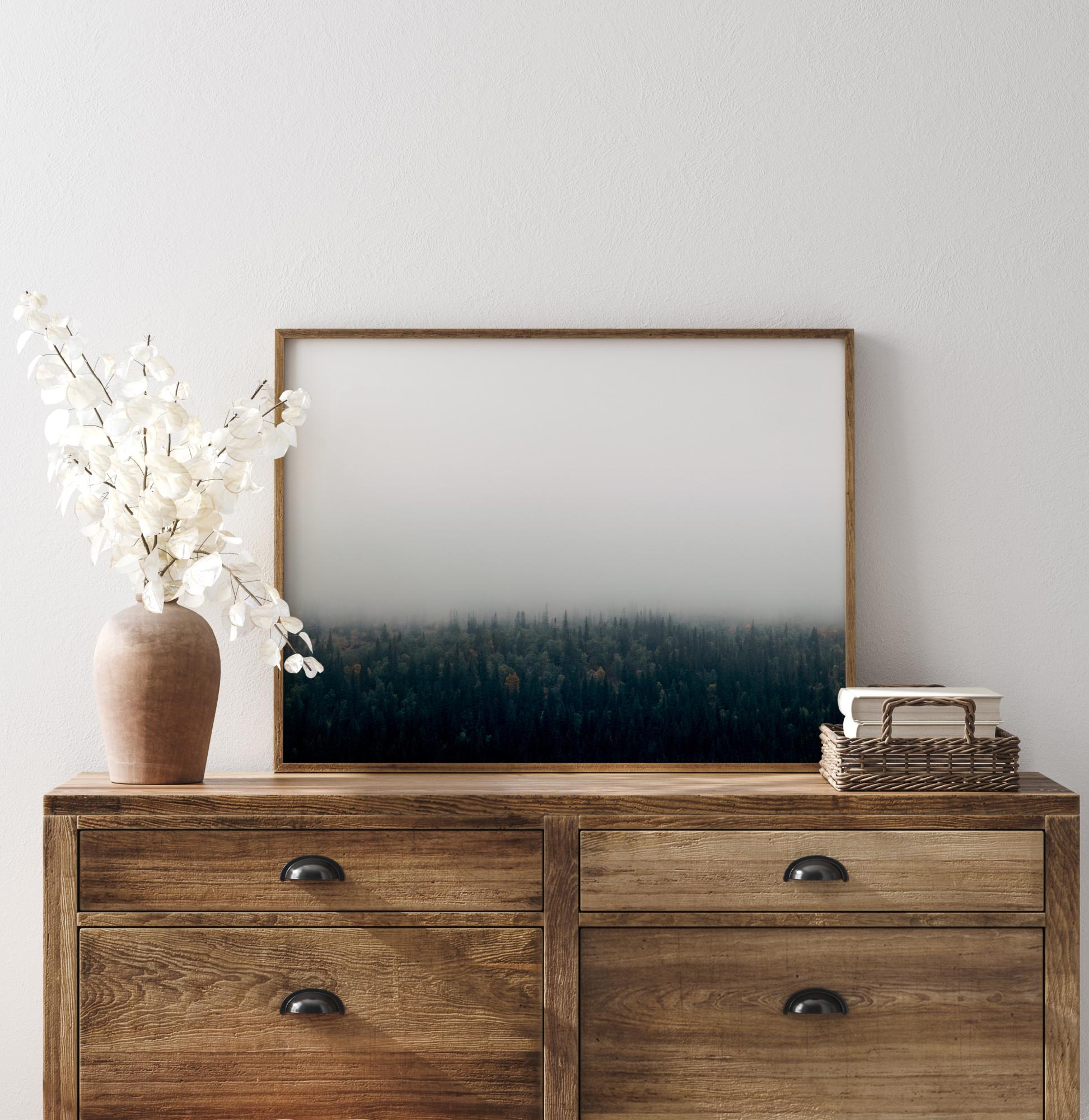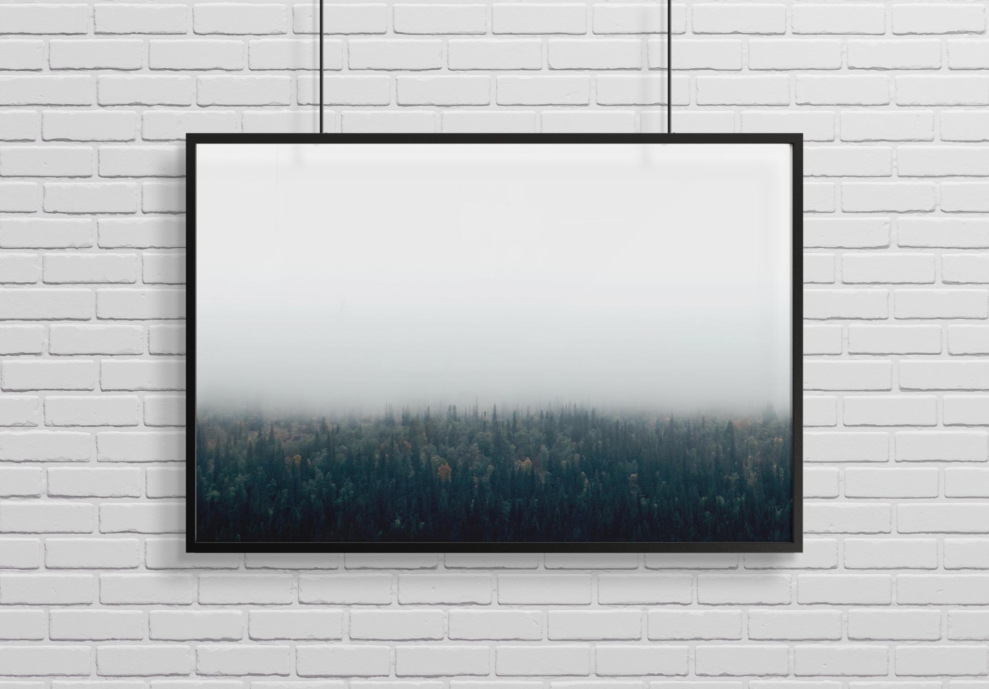 Egy fényképes poszter egy kiterjedt erdőről, amely sűrű köd alatt nyugszik. A zöld fák élesen kontrasztálnak a fehér égbolttal. Egy szép, természetközeli poszter, amelyet könnyű kombinálni más kedvencekkel. Miért ne készítene egy nagyobb képfalat természet témájú képekkel?