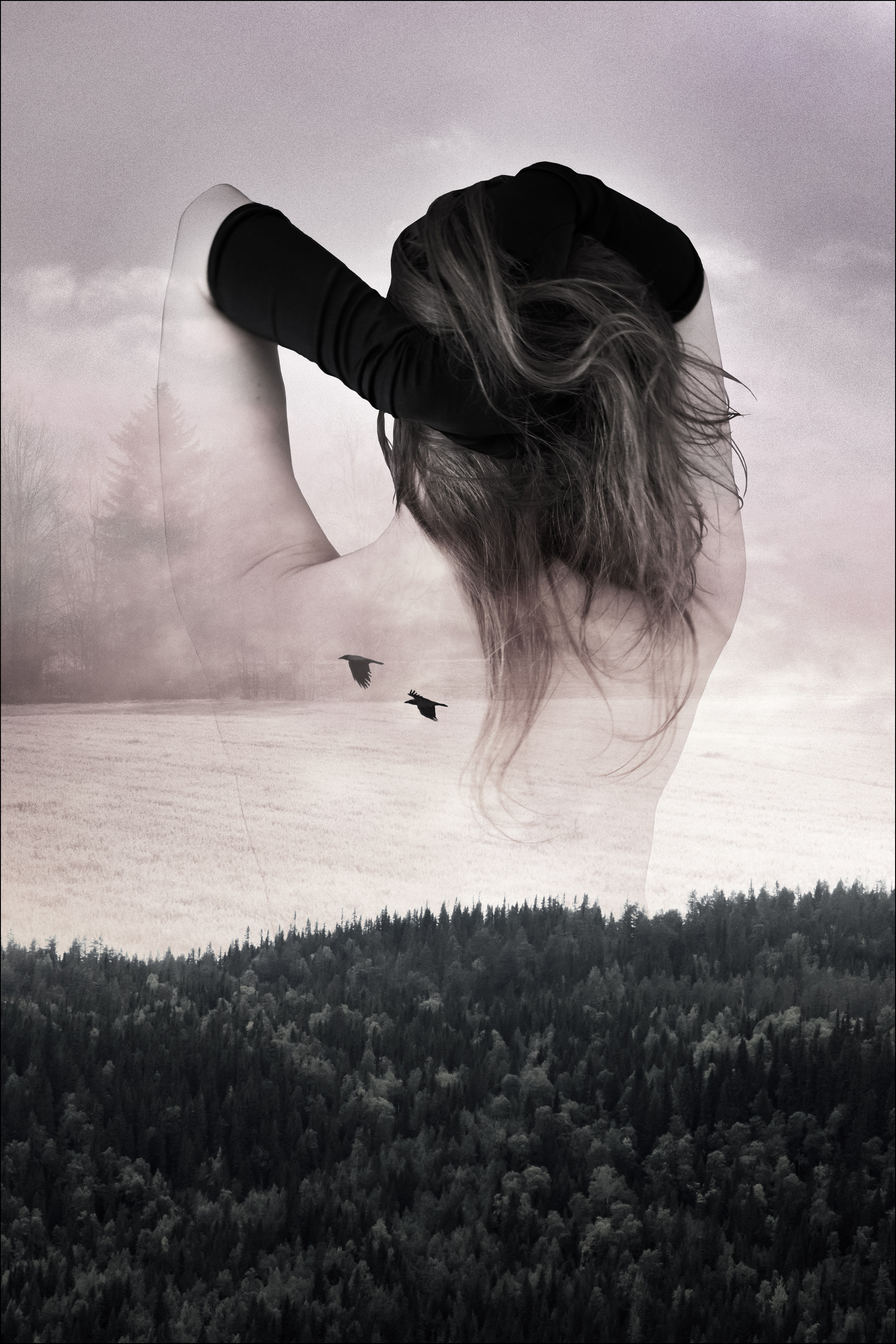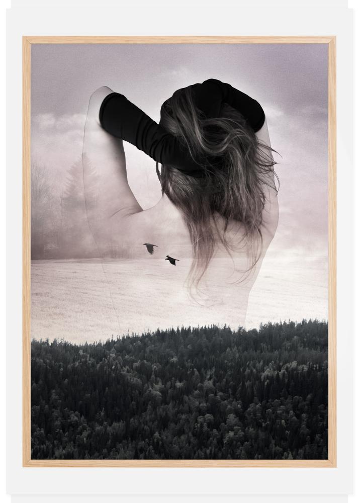Egy kollázsposzter, amelyen lent erdő és égbolt, valamint egy nő van egy rétegen a kép fölött. Az erdő lelke itt egyértelmű, mivel a sötét erdő felér az égig, ahol egy nő fekete kesztyűben áthúzza a kezét a haján. Élvezze ennek a valóban fantáziadús képnek a különleges összetételét.