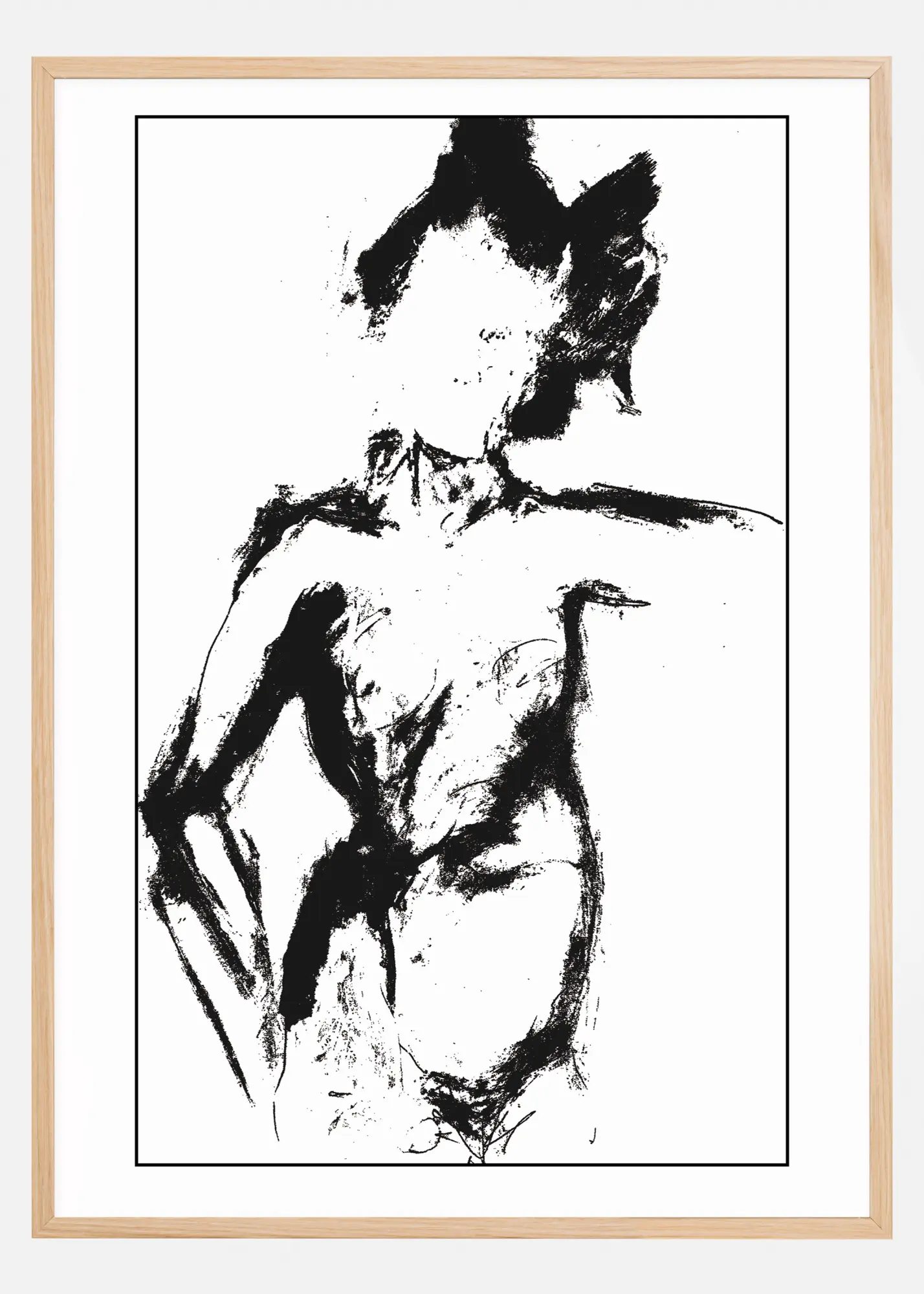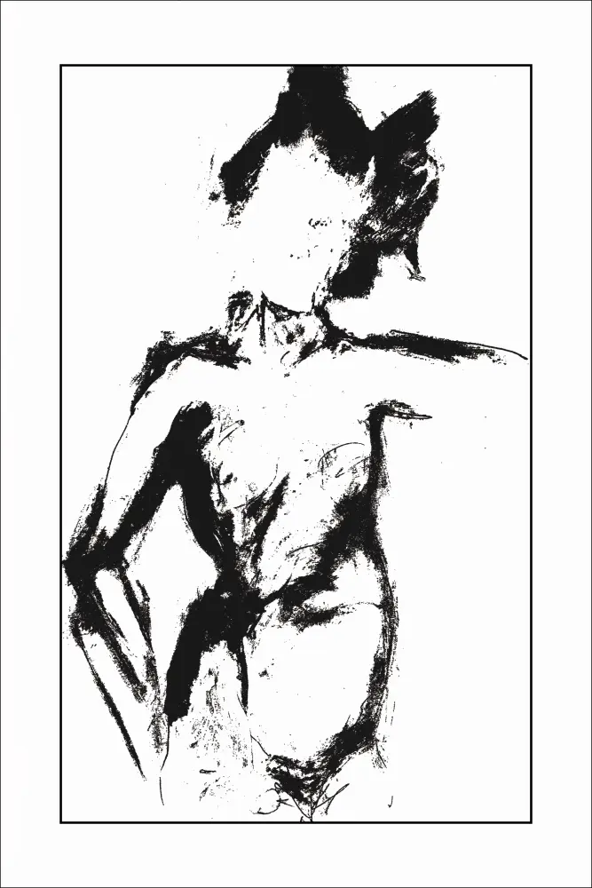 Egy fekete-fehér poszter egy figurális rajzzal. A vastag, merész fekete ecsetvonások szinte chiaroscuro-stílusban alkották meg ezt a nőt. Nézz rá egy pillanatra, és szinte elvárod, hogy mozogni kezdjen.