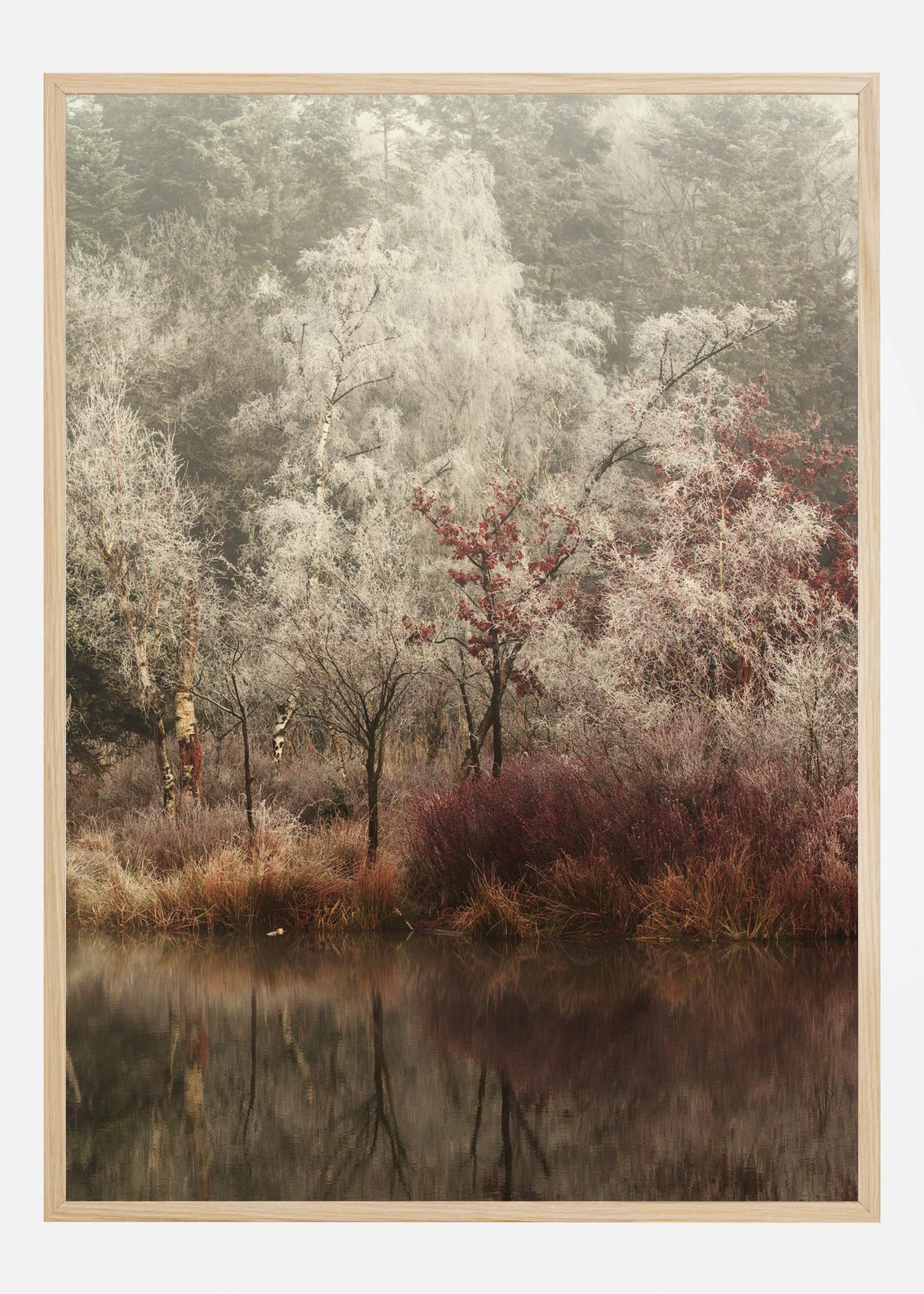 Egy csendes és nyugodt poszter egy fagyott erdei tájjal. Az előtérben egy tiszta és csendes tó látható, sötétvörös fűvel és dérrel borított fákkal a háttérben. Szinte érezni lehet a csendet és a nyugalmat, amelyet ez a gyönyörű, varázslatos kép sugároz.