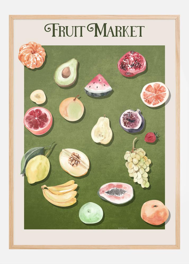 Ez a színes poszter egy élénk gyümölcspiac lényegét ragadja meg, és remek kiegészítője belsőépítészeti gyűjteményünknek. A print egy sor zamatos gyümölccsel, melyek gazdag zöld háttéren jelennek meg, vizuális élményt nyújt, létrehozva egy frissesség és bőség érzetét. A napon érlelt citrusféléktől az avokádó és gránátalma trópusi vonásaiig ez a mű vizuális élményt kínál, amely inspirál és feldob. Minden gyümölcs részletes ábrázolása kiemeli azok egyedi textúráit és formáit, így ez a poszter kötelező darab minden természetes művészetet kedvelő számára.