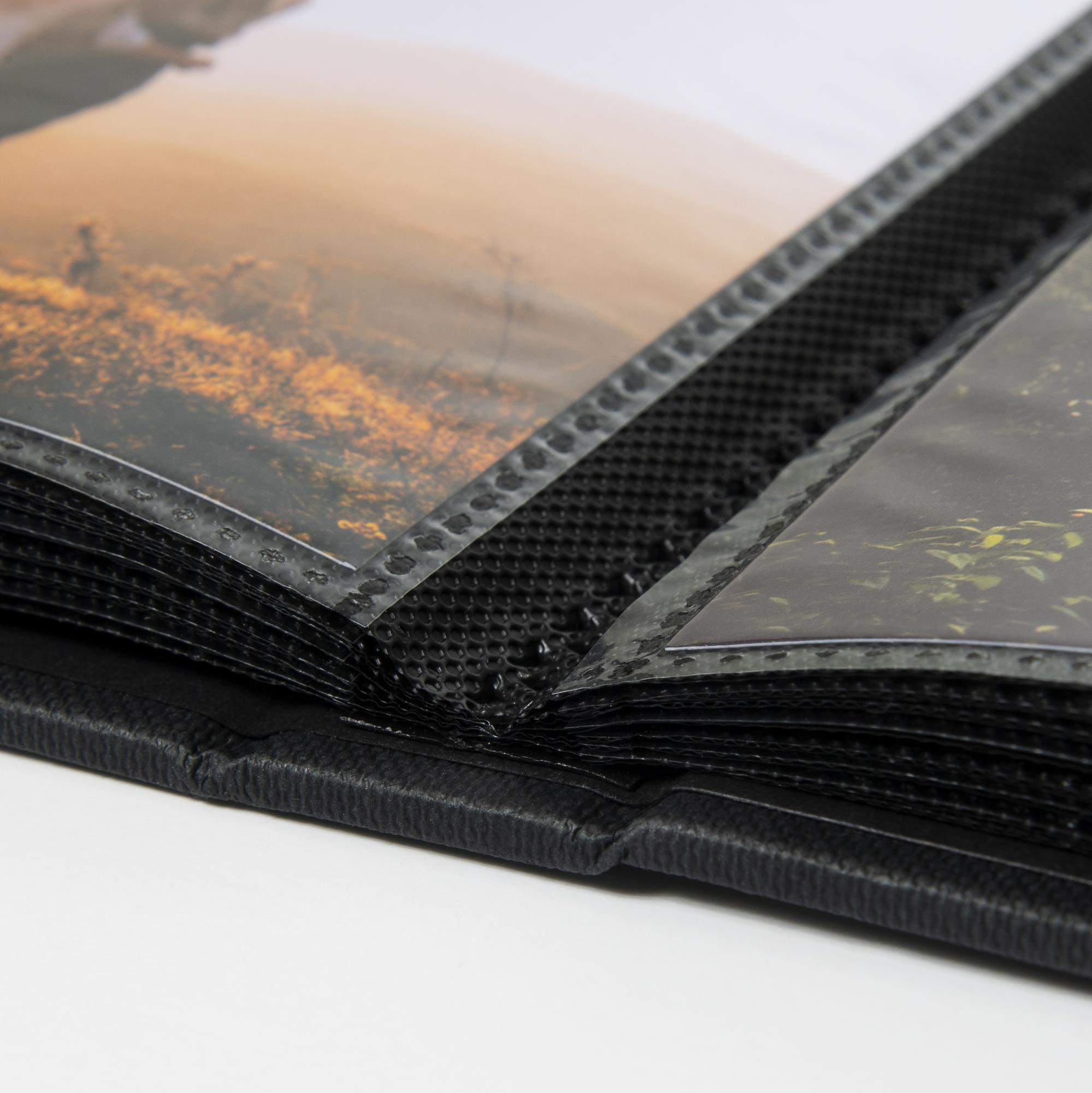 Az albumnak savmentes papírból készült fekete lapjai vannak. A képek praktikus fotózsebekbe helyezhetők el.