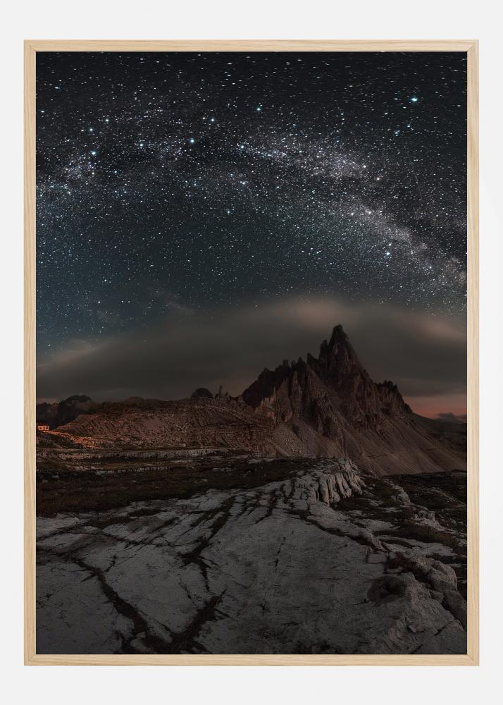Egy fantasztikus poszter a Dolomit-hegység tömegéről a galaxis felett. A vörös sziklák magasan a csillagok felé nyúlnak. A Tejút fényeiben csillogó csillaghalmazzá ível, varázslatos jelenetet teremtve. Akaszd fel ezt a faladra, és repülj egy fantasztikus világba.