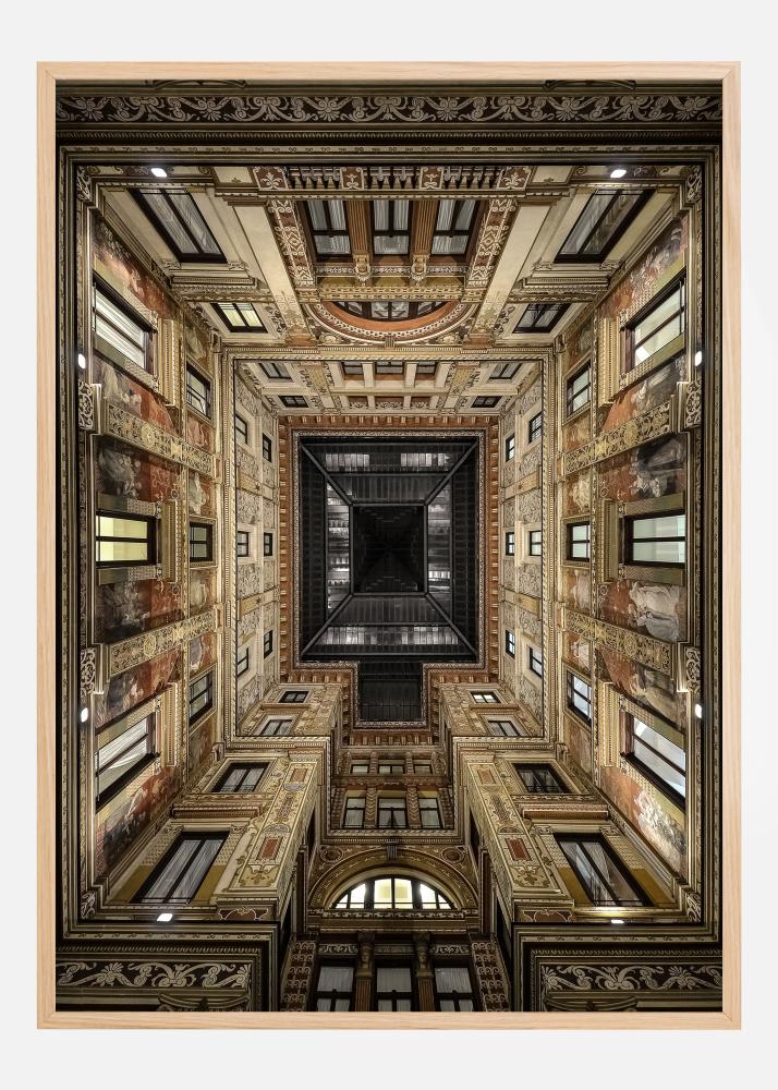 Ez egy belső poszter a Galleria Sciarráról és annak lenyűgöző építészetéről. Képzeld el, hogy az épületben vagy, felnézel a mennyezetre, és látod a csodálatos ablakokat és bonyolult mintázatokat. Vidd magaddal ezt az utazást otthonodba.