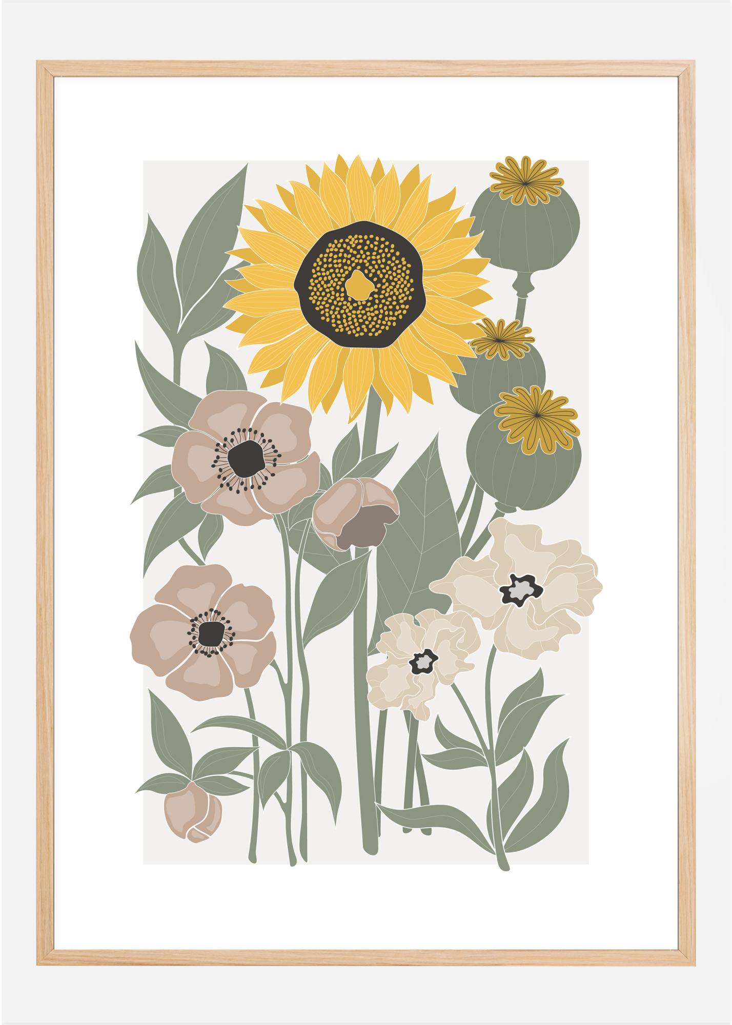 Egy puha poszter különböző virágokkal. Egy világos napraforgó uralja a kép közepét, más virágokkal, mint a pipacs ebben a kertiposzterben. Az egyszerű stílus megkönnyíti a részletek látását és lehetővé teszi, hogy élvezze ezt a napos képet.