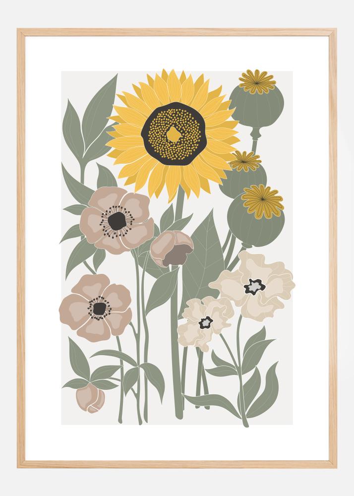 Egy puha poszter különböző virágokkal. Egy világos napraforgó uralja a kép közepét más virágokkal, mint például pipacsokkal ebben a kertiposzterben. Az egyszerű stílus megkönnyíti a részletek megtekintését és az ezen a napos képen való gyönyörködést.