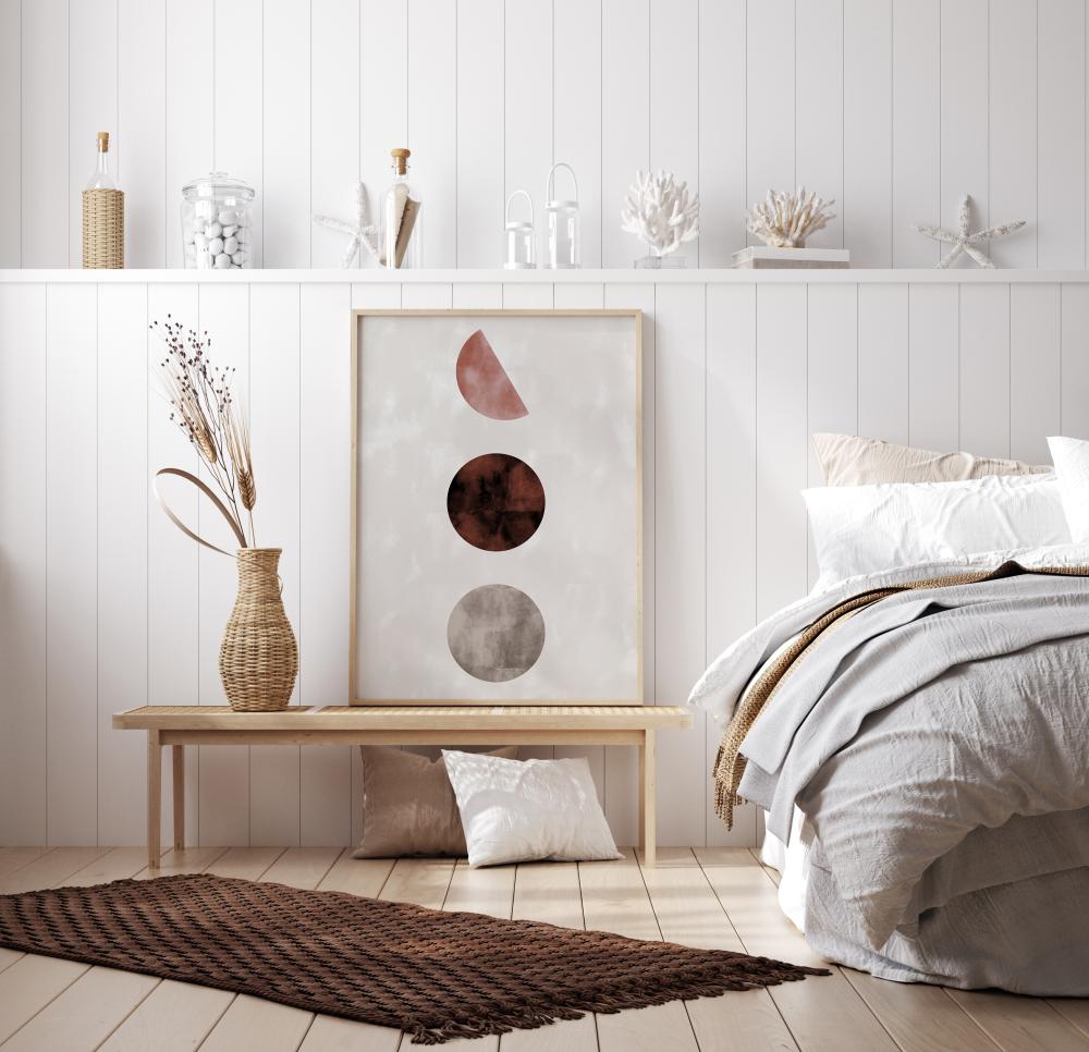 Egy geometriai poszter két körrel és egy félkörrel fehér háttér előtt. Az alsó kör zöld, a középső barna, a tetején lévő félkör pedig rózsaszín és oldalra van fordítva. Akaszd fel ezt az egyszerű, de vonzó, absztrakt dizájnt egy egyszerű falra, hogy stílust és osztályt adjon neki.