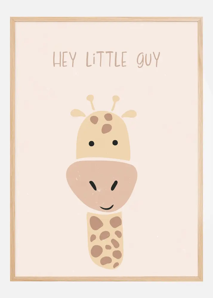 Ez a bájos poszter a "HEY LITTLE GUY" felirattal és egy zsiráfborjú illusztrációjával tökéletes faldekoráció gyerekszobába vagy egy másik világos helyiség játékos hangulatának fokozására. Az ábrát enyhe színek jellemzik, mint a lágy rózsaszín a háttérben, valamint meleg bézs és barna árnyalatok a zsiráf rajzán. Az egyszerű és gyerekbarát dizájnú rajzolt zsiráf nagy mosollyal és barátságos szemekkel rendelkezik, ami azonnali kapcsolatot teremt és hozzájárul egy vidám és befogadó légkörhöz.