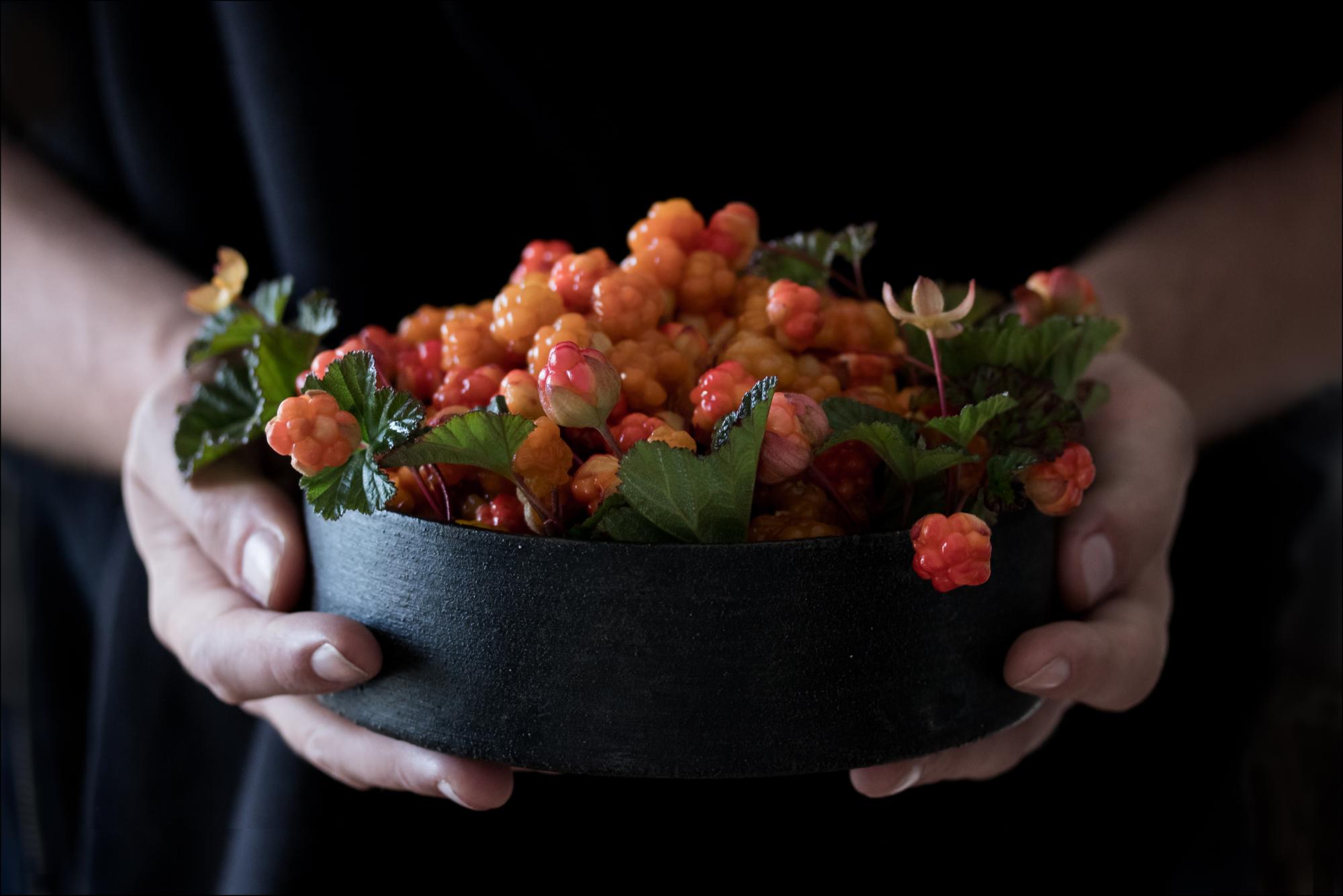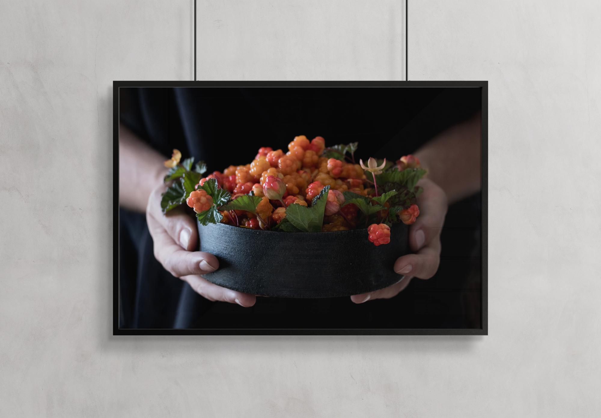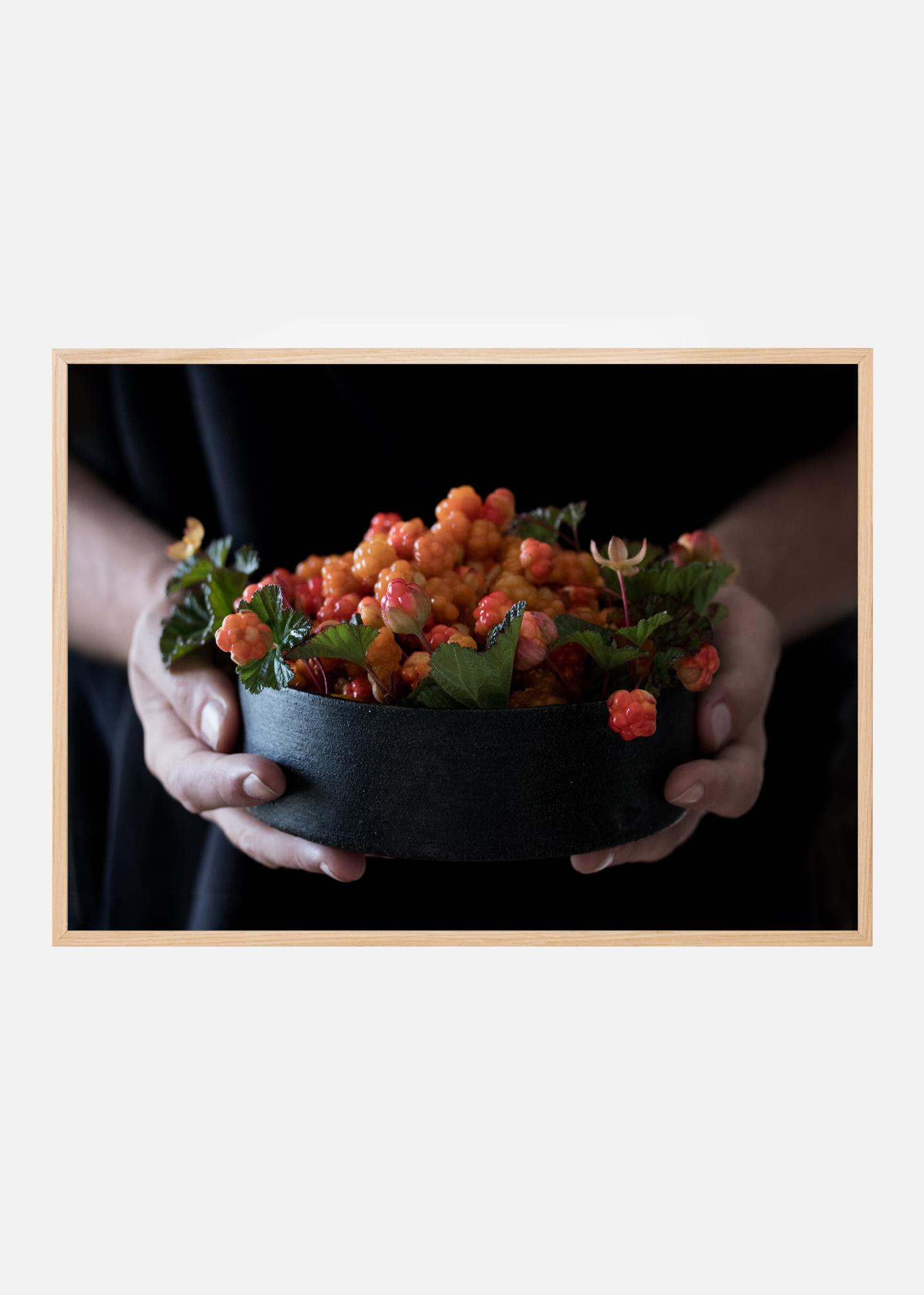 Egy gyümölcsposzter arany bogyókkal, melyek egy tálban vannak, amit két kéz tart. Ez a friss fotó az arany bogyókat és leveleket egy egyszerű fekete tálban mutatja. Két kéz fogja, és úgy tartja, mintha éppen neked akarná átadni.
