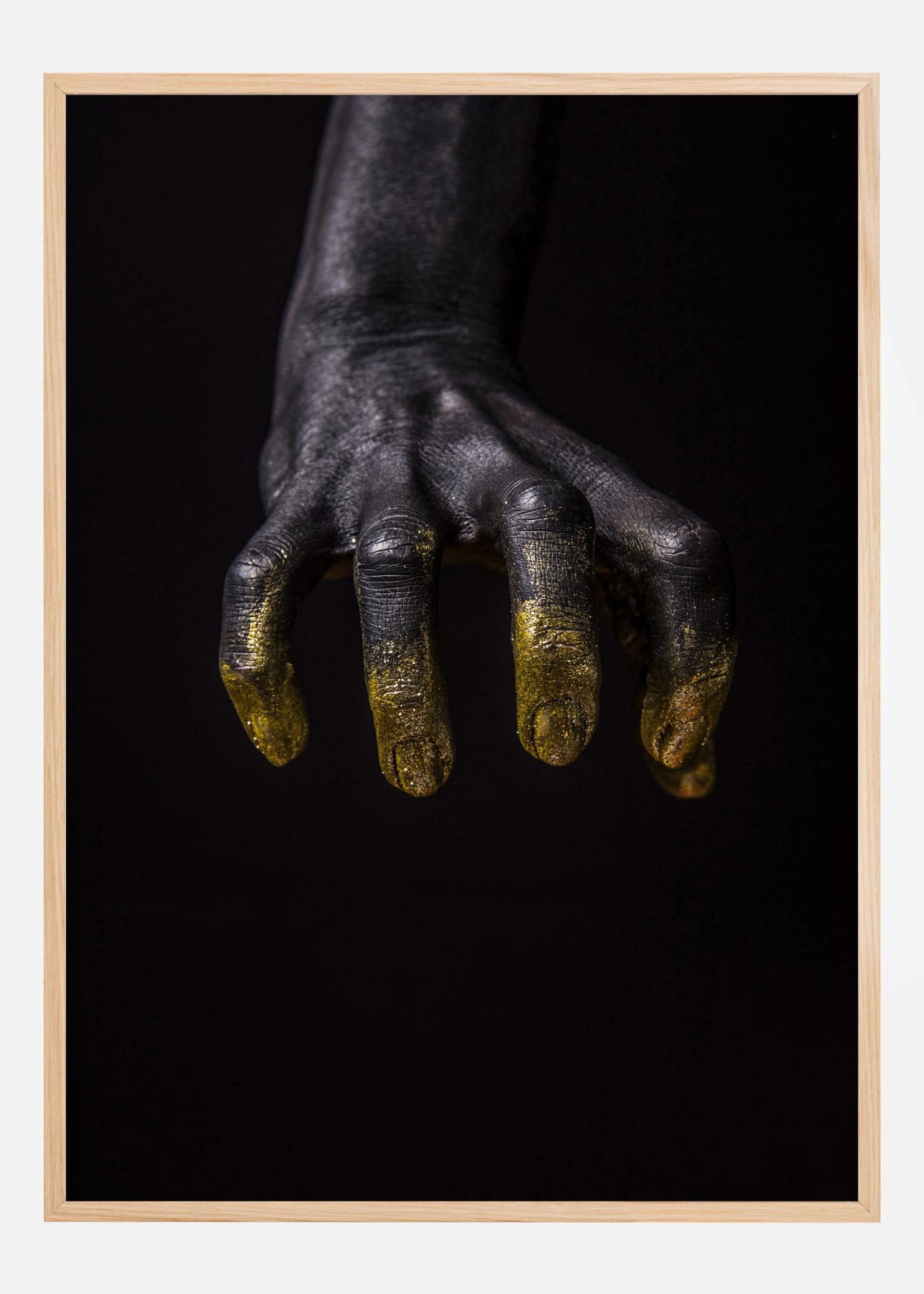 Egy drámai poszter egy ragacsos kézről, amely lefelé nyúlik. Egy fekete kéz érkezik felülről a fotóra, az ujjak meghajolva, készen arra, hogy megragadjanak valamit. Az ujjbegyeket csillogó arany borítja, hogy kitűnjenek. Tegye ezt az epikus képet az otthonába.