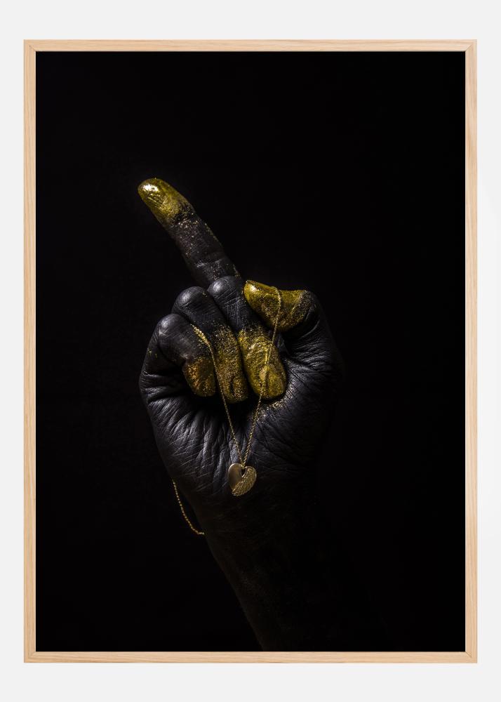 Egy drámai poszter fekete kézzel, arany ujjakkal, amely balra mutat. Az ökölbe szorított kéz a mutatóujjával mutat valamire, amit nem látunk. A kéz körül egy arany medál lóg, amely elegánsan esik az aranyszínű ujjak fölé. Akassza fel ezt egy fehér vagy krémszínű falra a hatásos megjelenés érdekében.