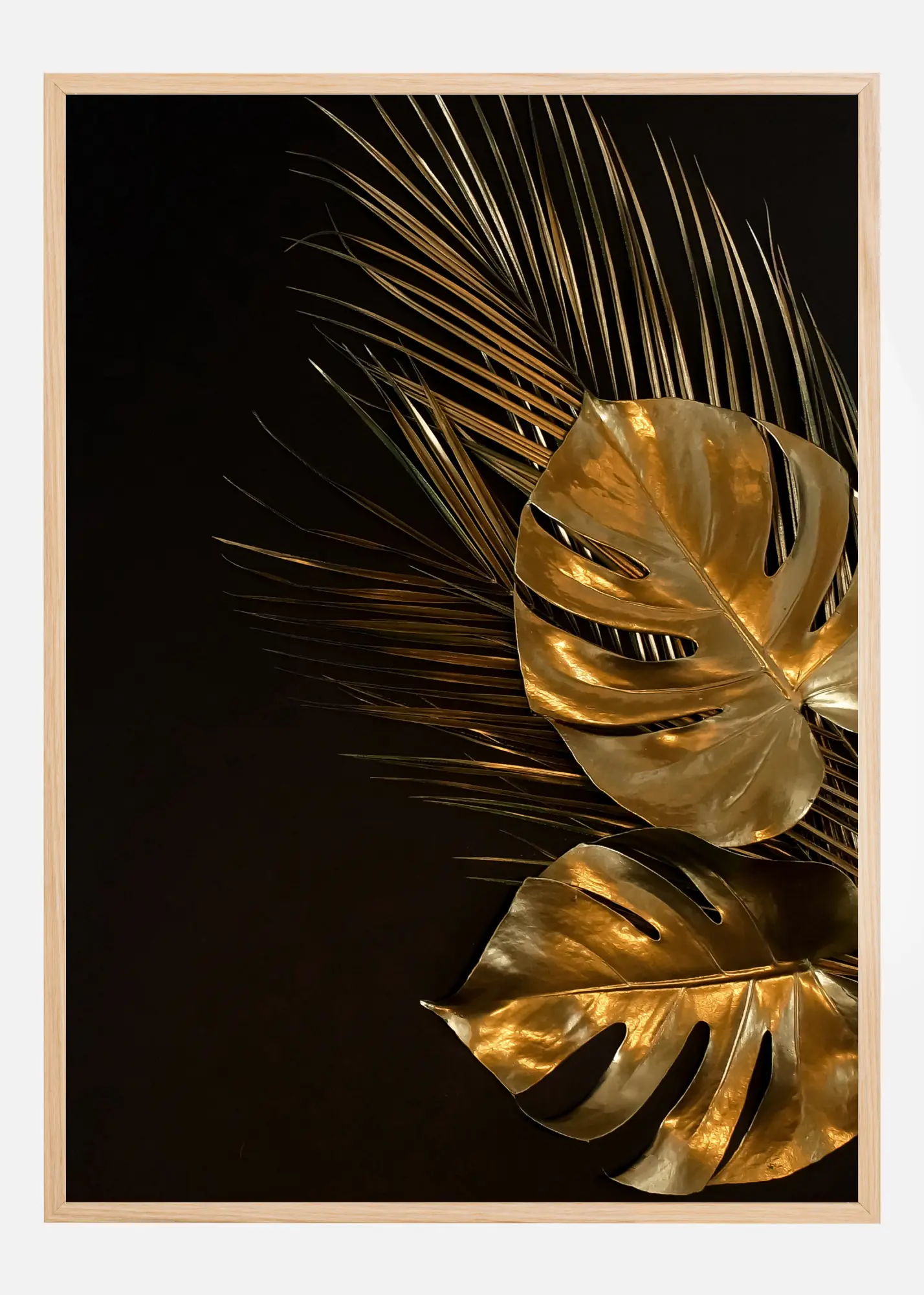 Egy természet poszter világos arany levelekkel fekete háttér előtt. Monstera arany levelek és aranyszínű páfránylevelek töltik meg ezt a lenyűgöző képet. Az arany csillogása olyan ragyogást kelt, amely a fekete háttér ellenére is elegáns, mégis ünnepi hangulattal világítja meg a szobát.