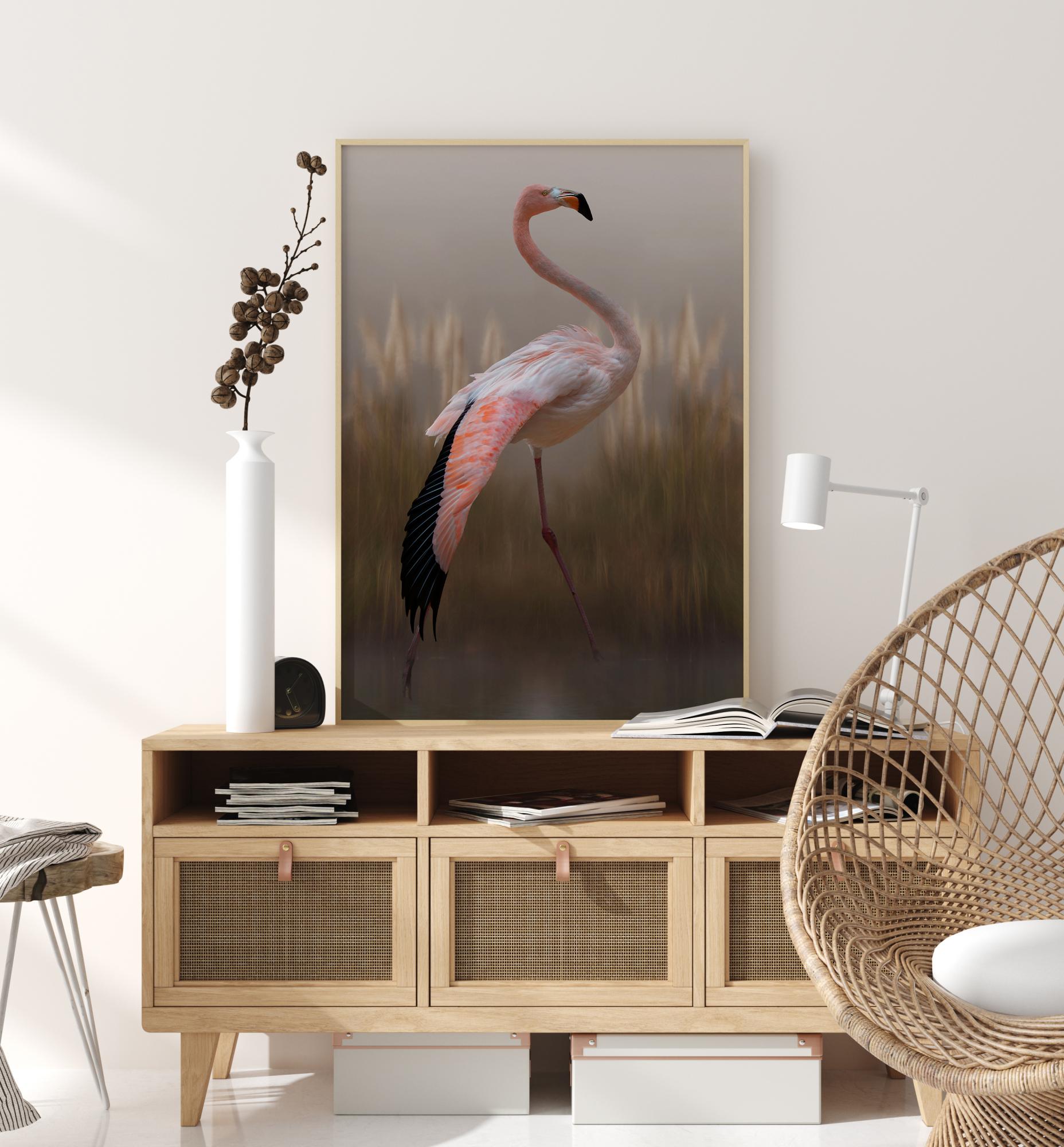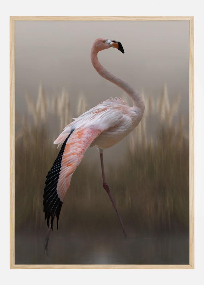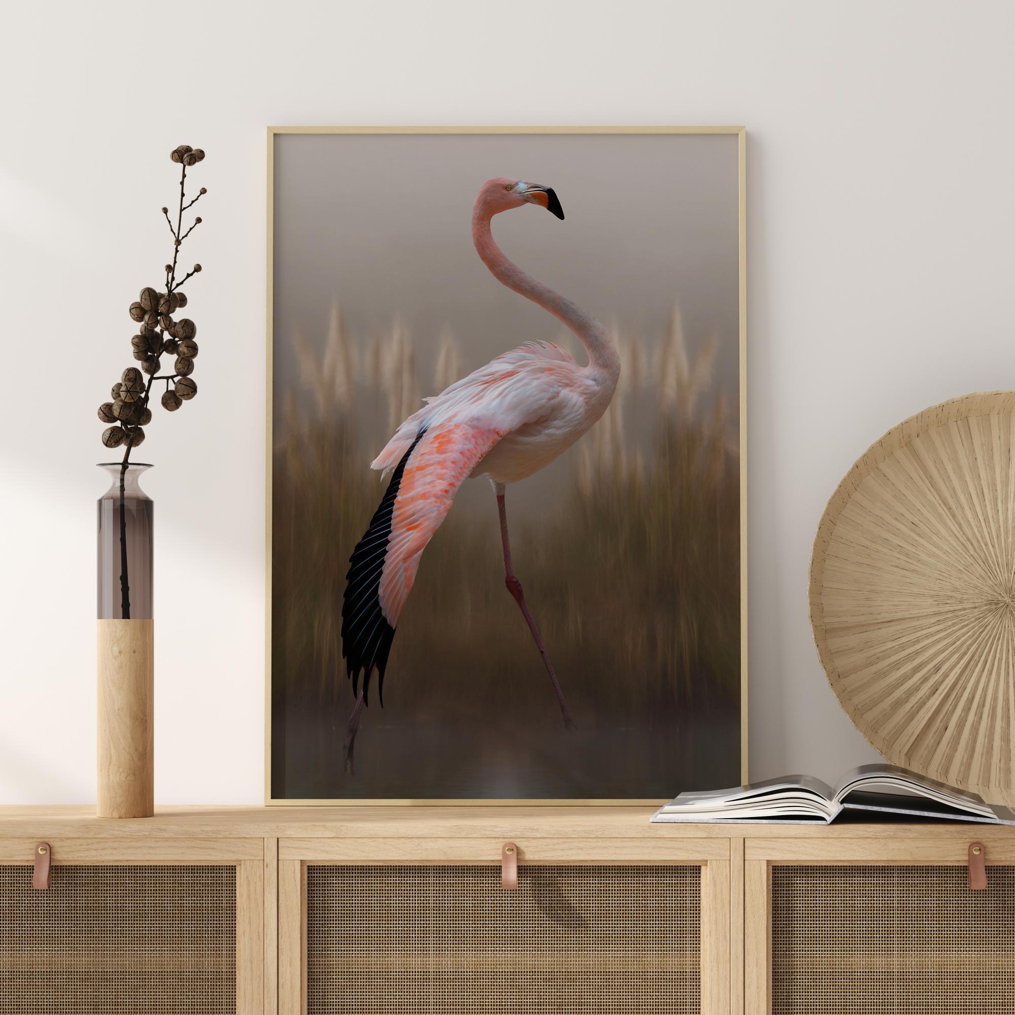 Egy állati poszter egy rúgkapáló rózsaszín flamingóval. A színárnyalatok és a fénykép elmosódottsága szinte egy festmény érzetét kelti. El tudod képzelni, ahogy a madárral együtt sétálsz, amikor ezt a posztert egy egyszerű kék fallal párosítod.