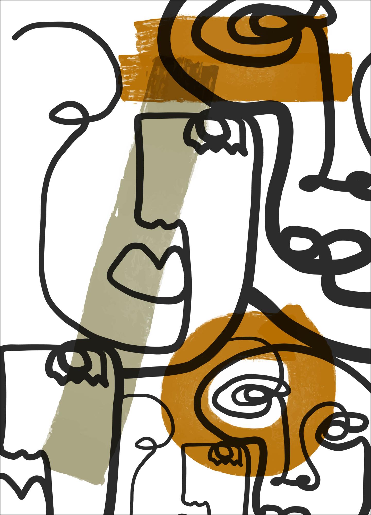 Egy grafikus vonalművészeti poszter feketével festett arcokkal, fehér, szürke és barna háttér előtt. Egy absztrakt és élénk poszter, amely tökéletesen illik a modern otthonba, és ugyanolyan jól mutat a konyhában és az előszobában, mint a nappaliban vagy a hálószobában.