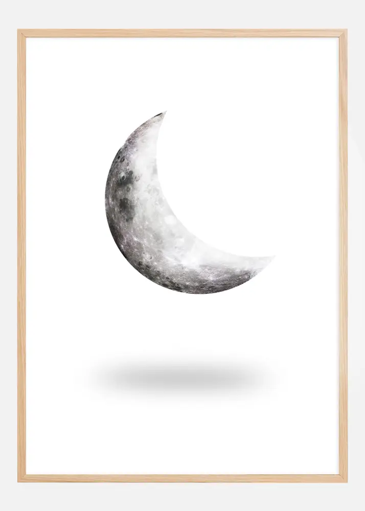 Ez a poszter a növekvő fázisában lévő Hold bájos illusztrációját mutatja be, ahol a sötét kráterek és a világosabb magaslatok lenyűgöző mintát hoznak létre a felszínen. A Hold tiszta és minimalista kialakítása, részletgazdag textúrájával a tiszta fehér háttér előtt, időtlen képet alkot, amely bármely helyiségben nyugalmat és egyetemes szépséget teremthet.