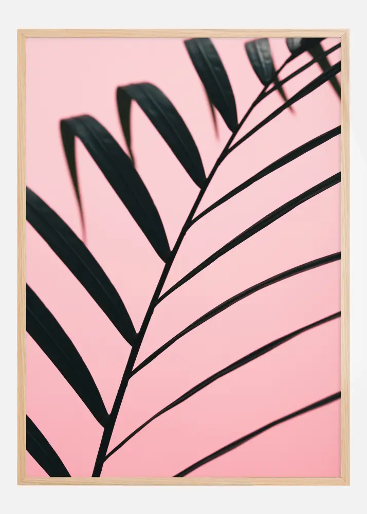 Átgondolt kompozíciójával és kiegyensúlyozott színpalettájával ez a plakát nemcsak dekoratív részlet, hanem a modern design tiszta vonalainak tisztelgése is. A fekete pálmalevél motívuma éles kontrasztban áll a rózsaszín háttérrel, ami ennek a természet művészi értelmezésének egyedülálló és feltűnő megjelenést kölcsönöz. Ez a nyomat kiválóan alkalmas azok számára, akik egy organikus elemet szeretnének hozzáadni otthonukhoz, modern és stílusos érzéssel.