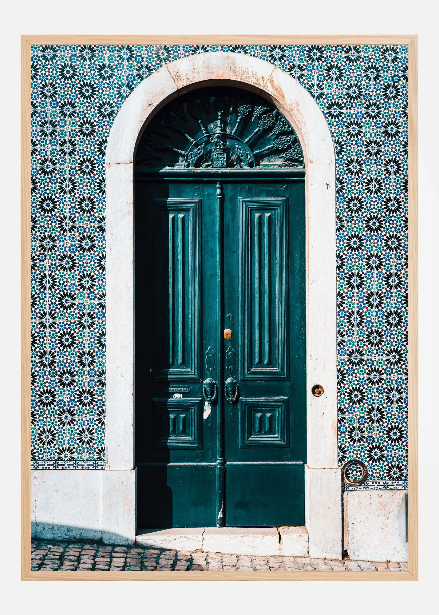 Ez a stílusos poszter egy tekintélyes zöld ajtót ábrázol, amelyet gyönyörűen kereteznek hagyományos, részletes kék és fehér csempék. Az ajtó klasszikus kialakítása és merész színe ellentétben áll a bonyolult mintákkal, ami barátságos és kulturális gazdagság érzését kelti. A kép azt az érzést közvetíti, mintha egy meghitt otthon bejáratát látnánk, amely tele van történelemmel és karakterrel.