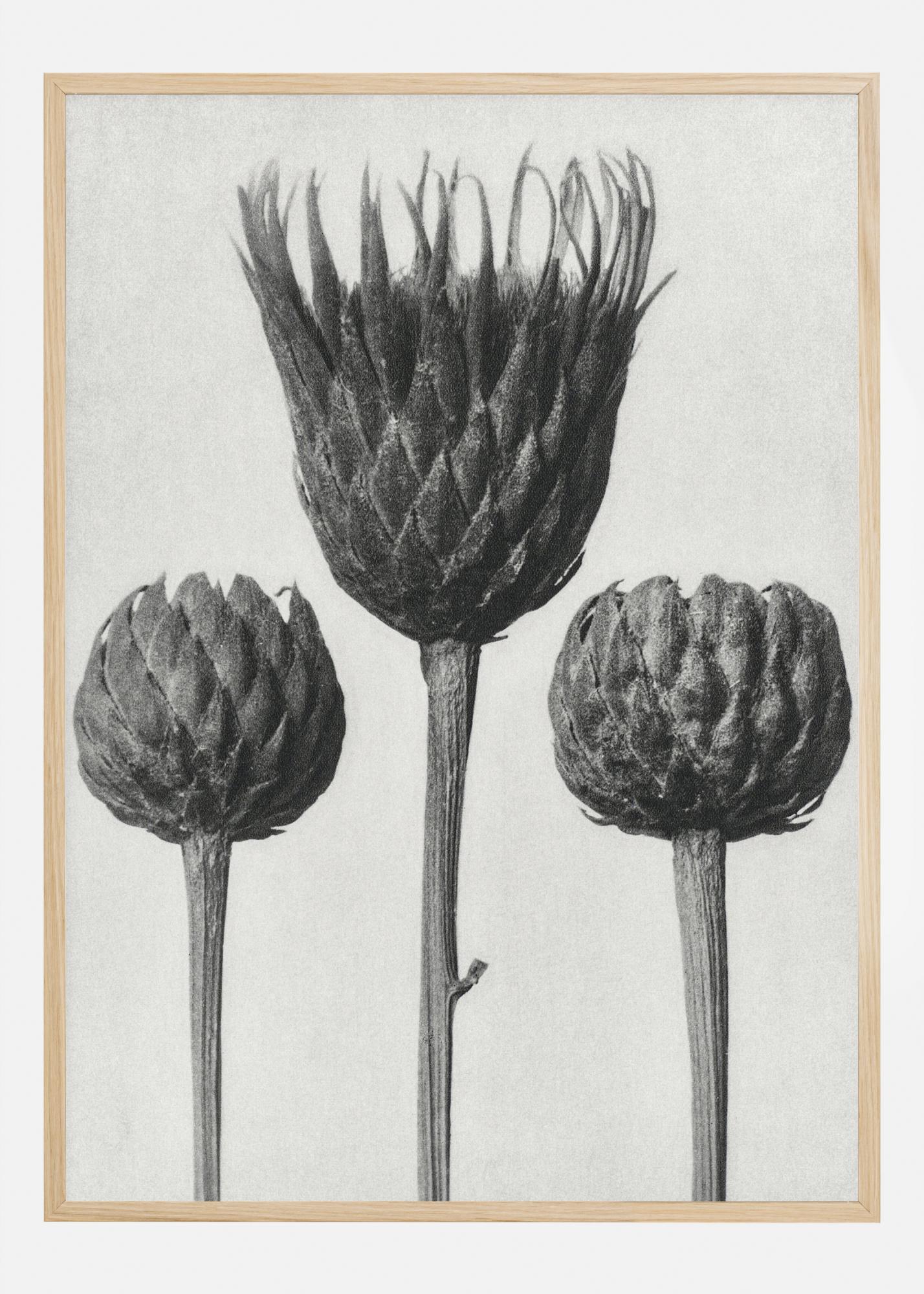Egy természetposzter három szürke virággal egyetlen száron. A három szürke virág magasan áll egy fehér háttér előtt, és szinte egymás mellett van elhelyezve. Az előtérben lévő szürke virág jobban kinyílt, mint a kisebb virágok. Ez a tökéletes nyomat, amit felakaszthatsz a télikertedbe.
