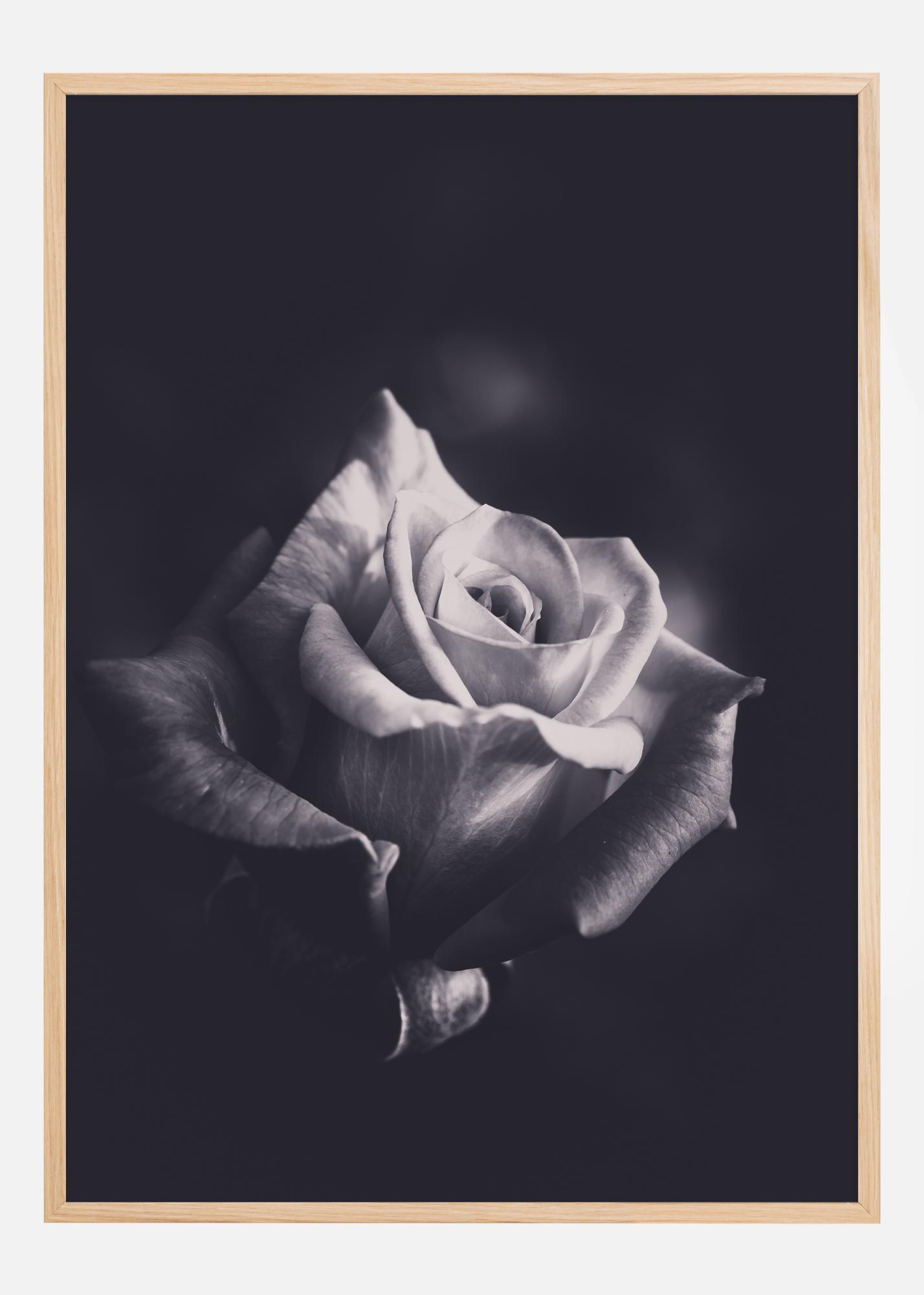 Ez a kifinomult poszter a szépség lényegét ragadja meg a legtisztább formájában egyetlen szürkeárnyalatos rózsával. Szirmainak elegáns kifelé bontása szimmetrikus és vonzó formát hoz létre, amely egyszerre finom és erőteljes. A kép mélyen részletezett, lágy átmenetekkel a fény és árnyék között, amelyek kiemelik a rózsa szerkezetének természetes szépségét.