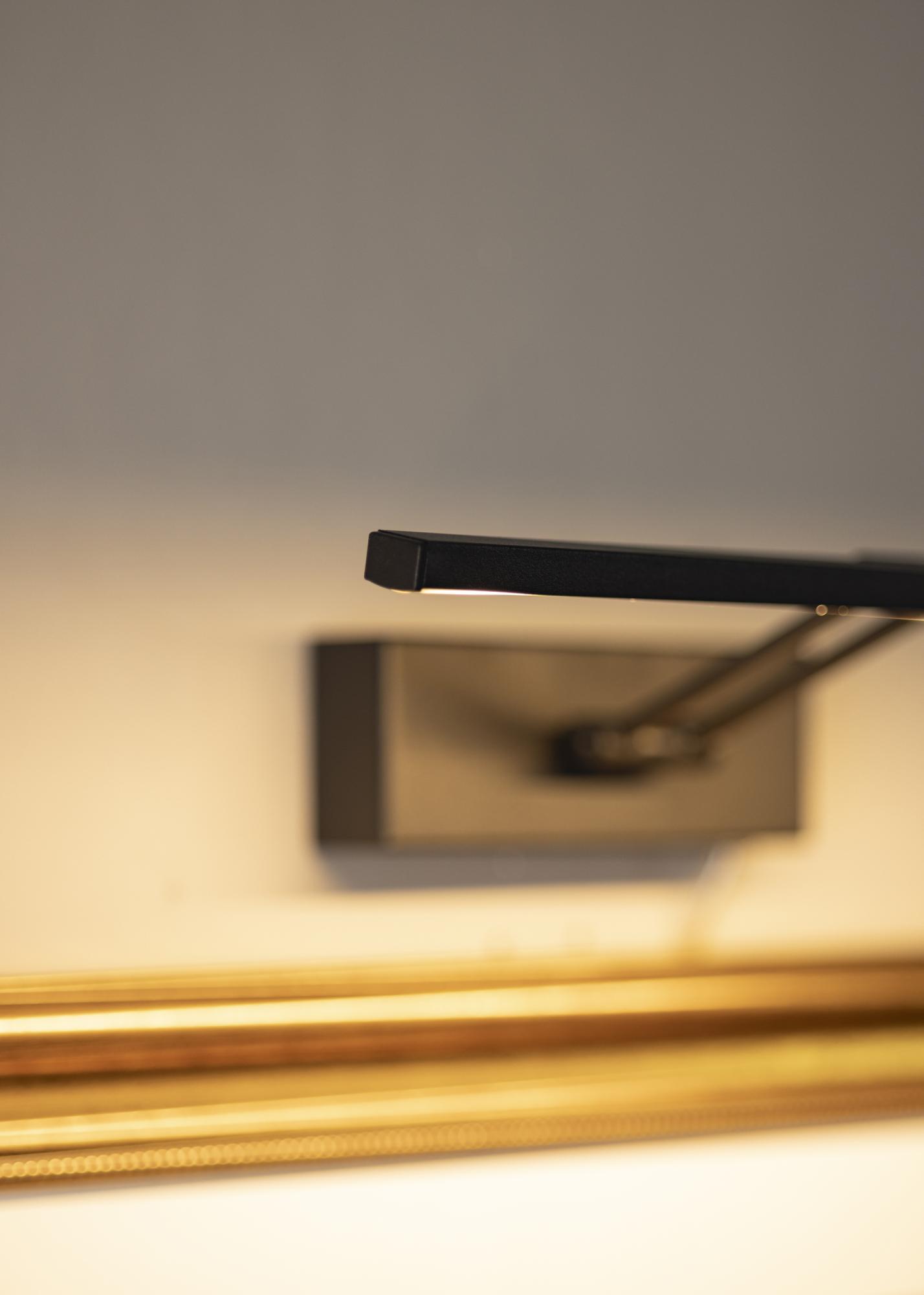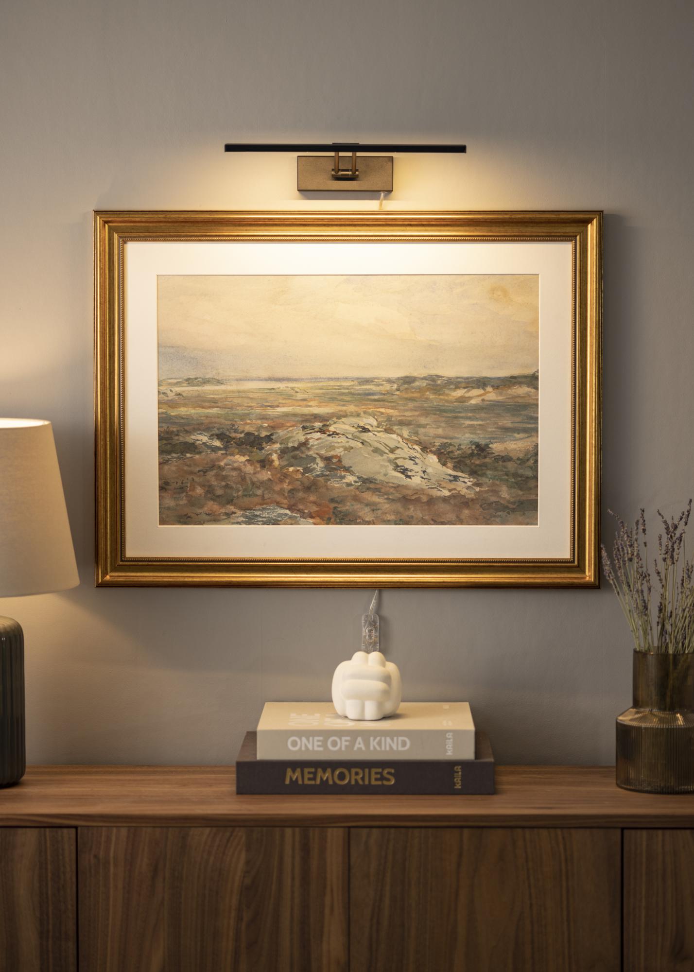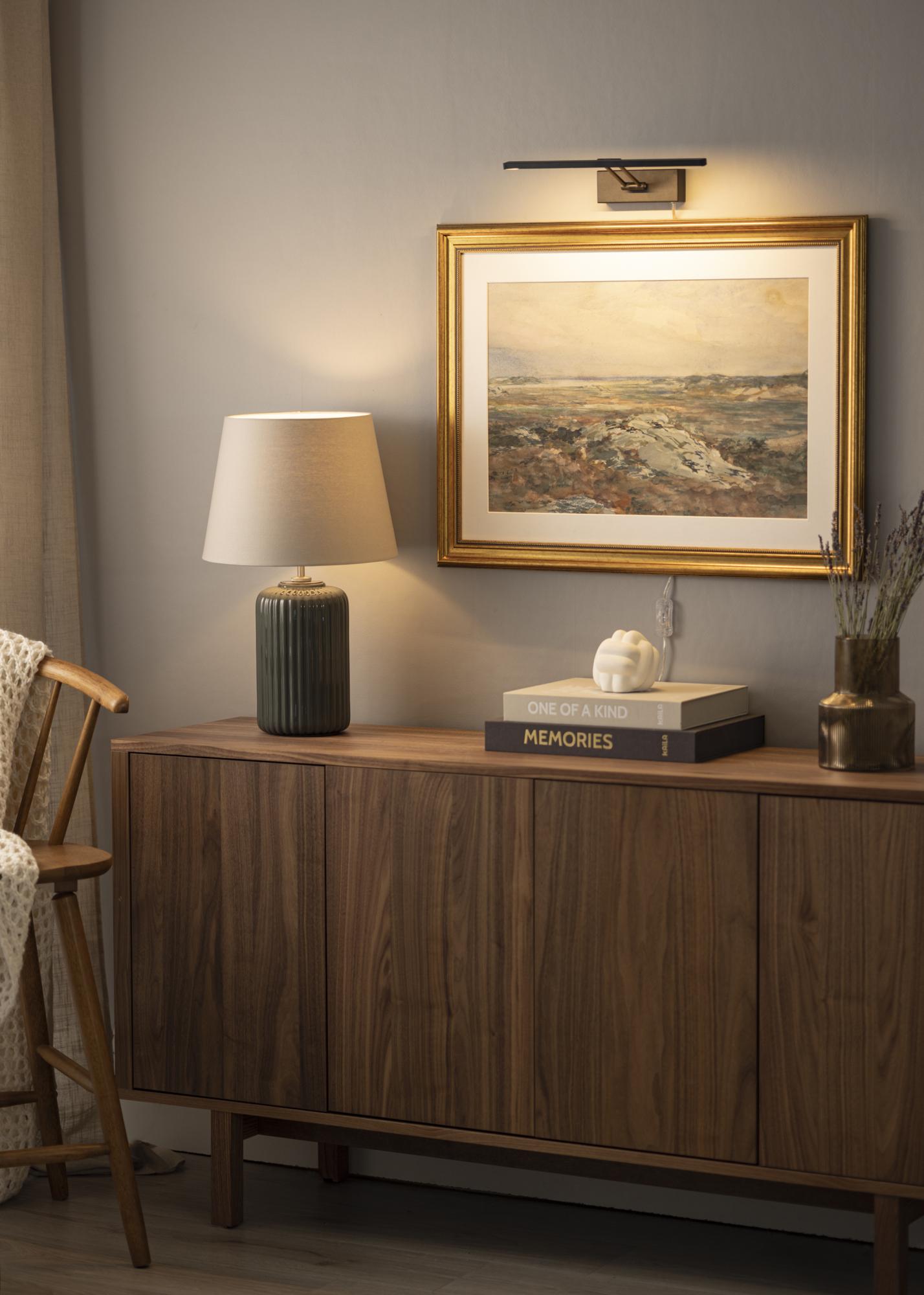 Képmegvilágítás modern svéd dizájnnal, amely 60-100 cm szélességű képekhez illik. A lámpatest magassága 5 cm, hossza 37 cm, és 20 cm távolságra van a faltól. Erős, 720 lumenes LED-világításának köszönhetően kellemes megvilágítást biztosít még nagyobb képek esetén is.