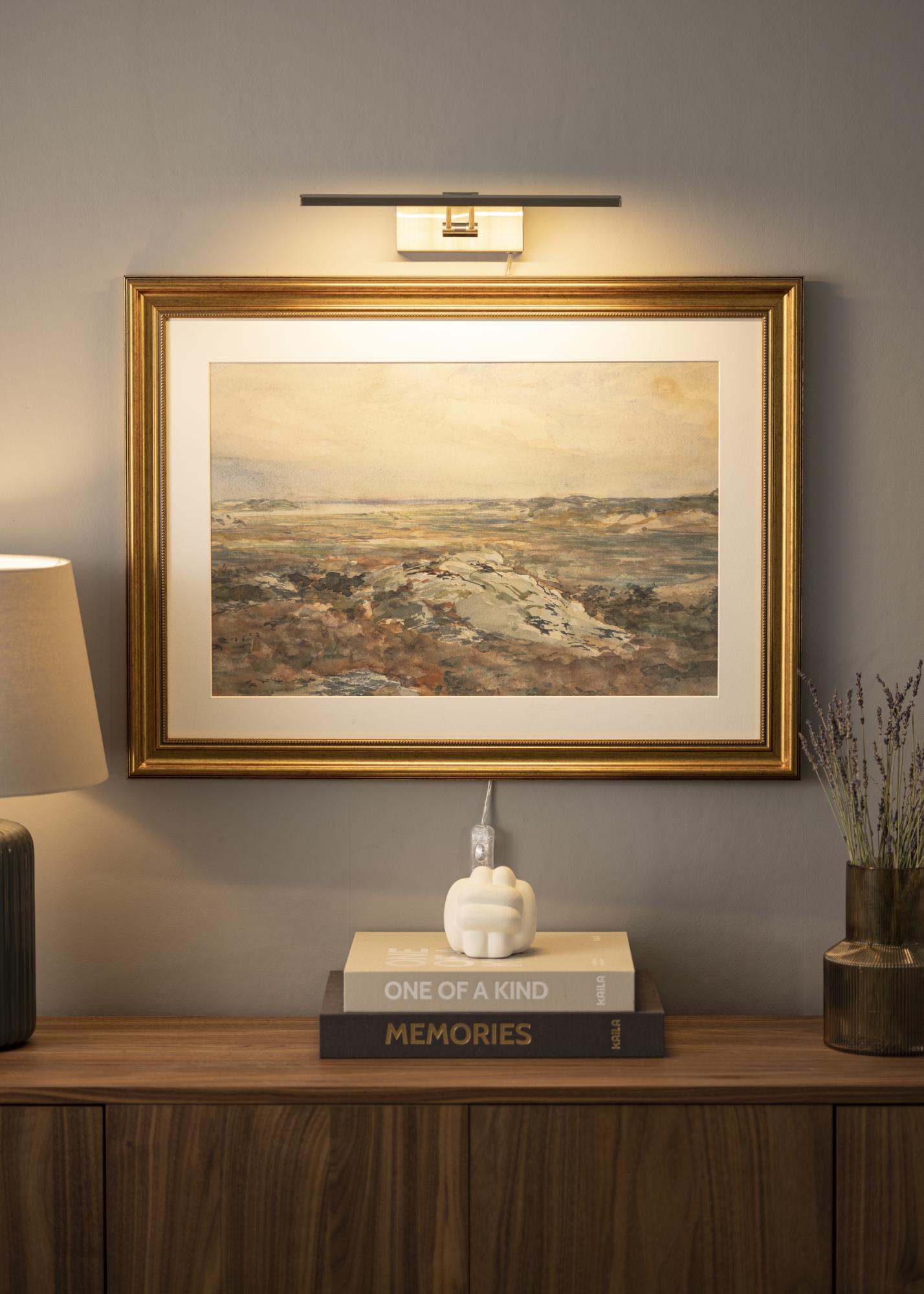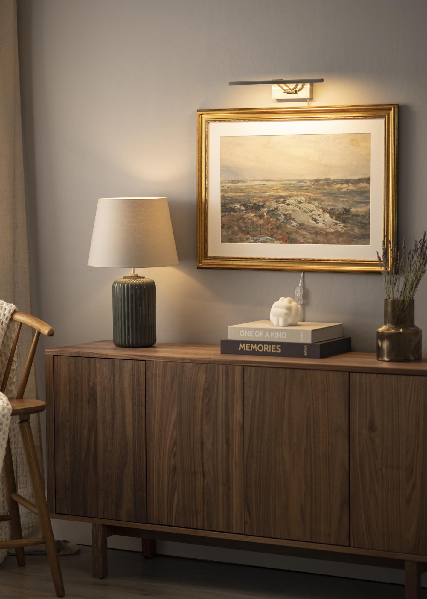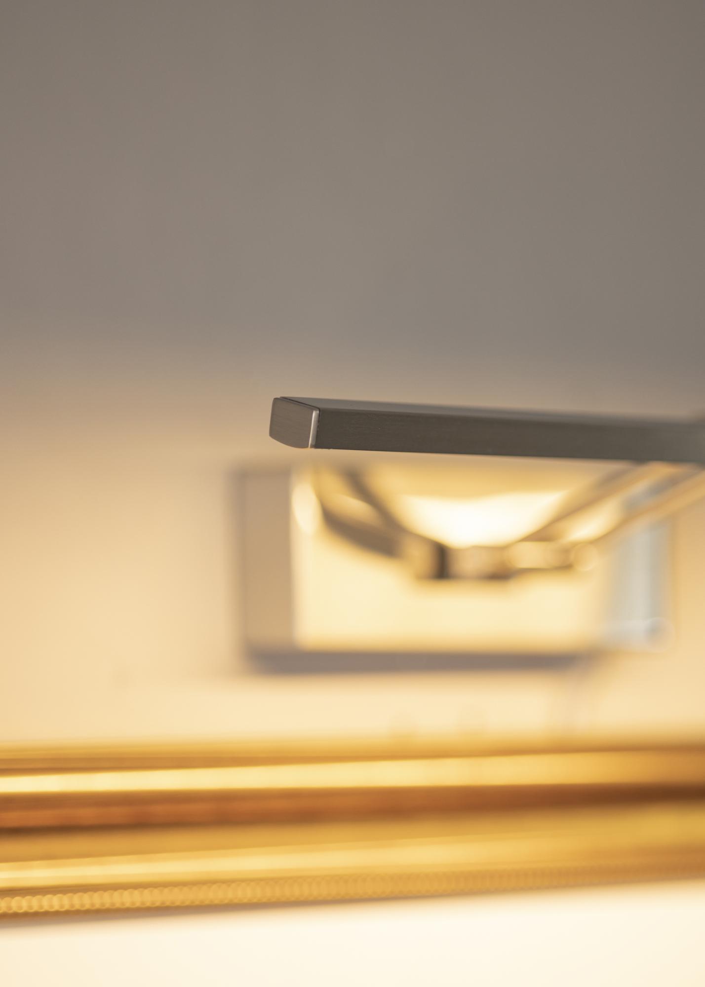 Modern svéd formatervezésű képművészet, amely 60-100 cm szélességű képekhez illeszkedik. Az armatúra 5 cm magas és 37 cm hosszú, a faltól való távolsága pedig 20 cm. Erőteljes, 720 lumen fényerejű LED világításával kellemes megvilágítást biztosít még nagyobb képeken is.