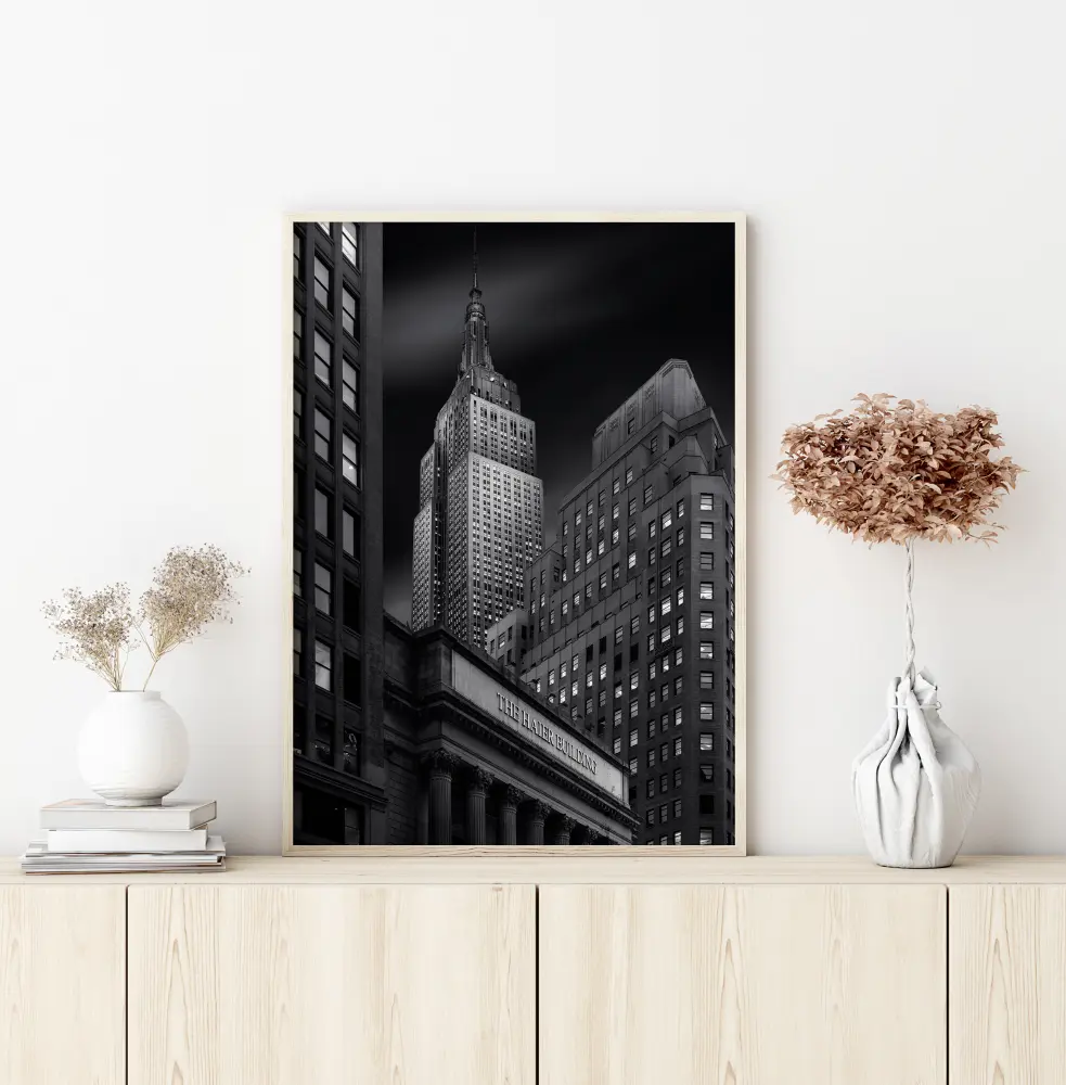Egy poszter a New York-i Haier Building-ről éjszaka. Az épület fényes aranybetűi világítanak, kiírva: "The Haier Building". Az épületek egy fekete városi panoráma előtt állnak, amitől ez egy nagyon feltűnő kép. Ez a drámai fekete-fehér poszter New York belvárosáról tökéletes egy fehér falra.