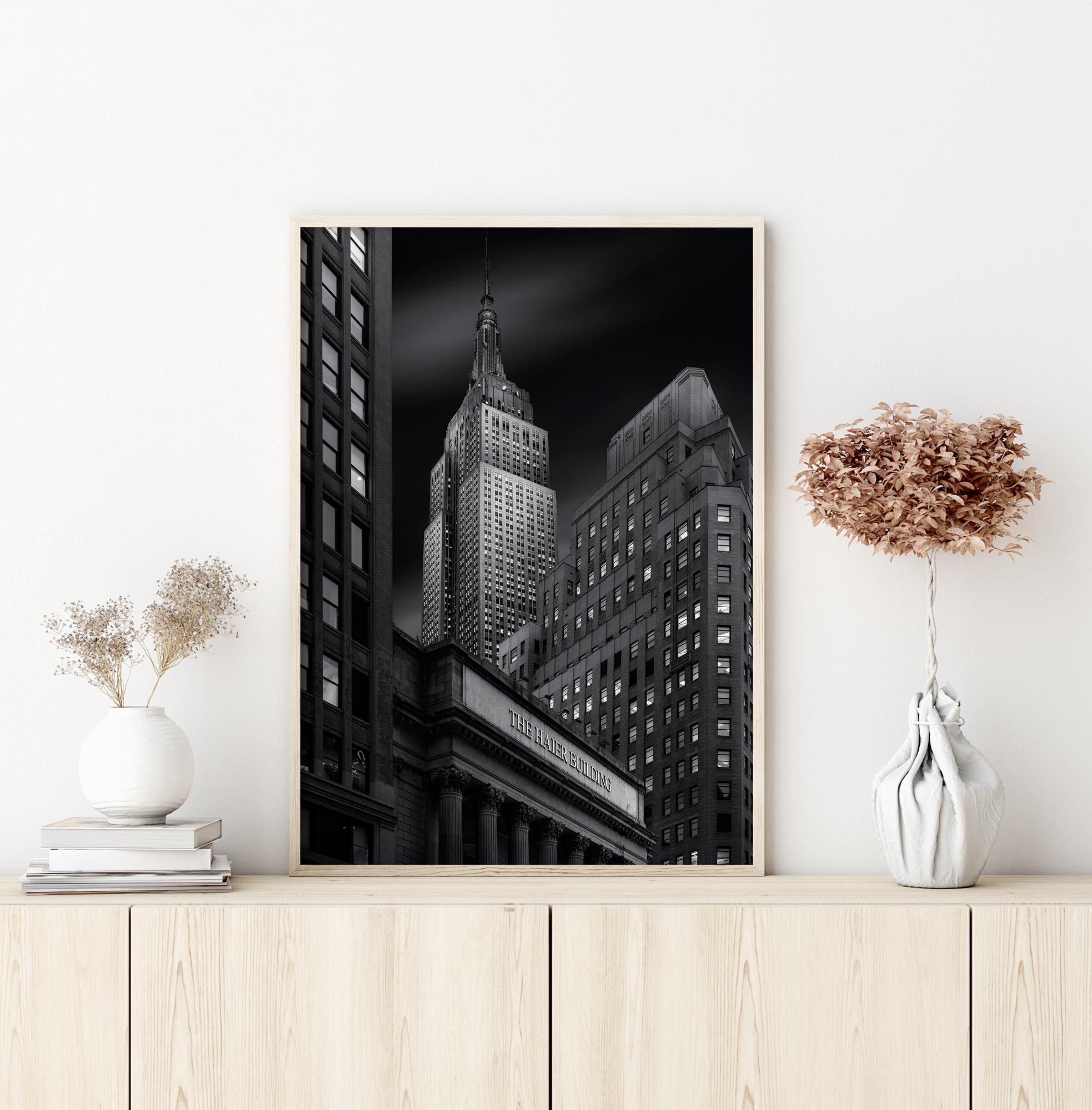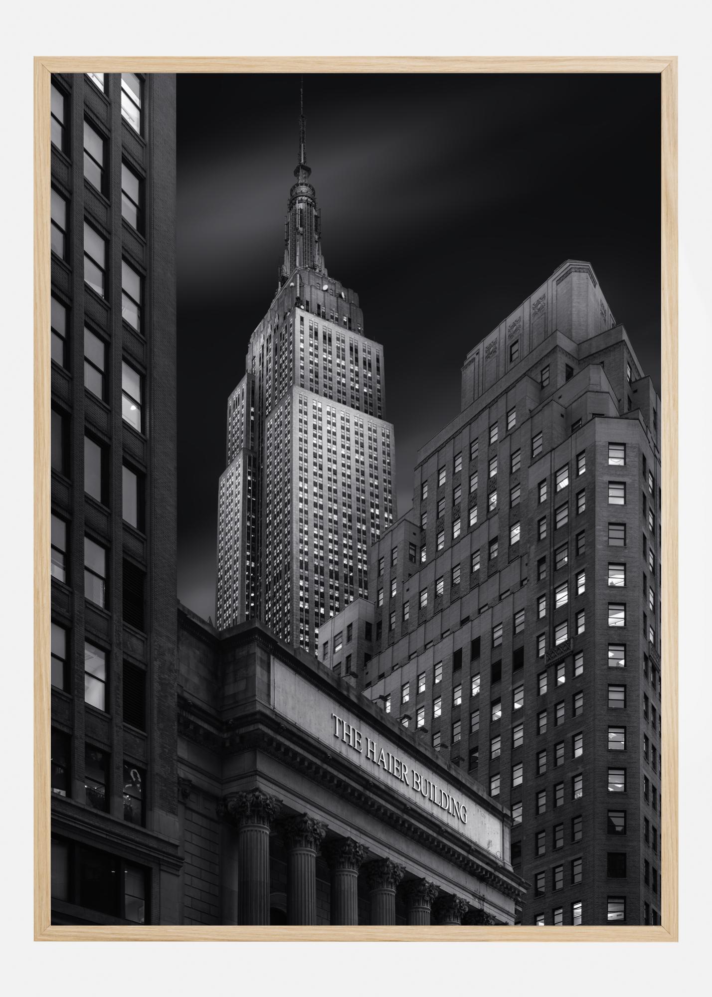 Egy poszter a Haier Épületről New Yorkban éjszaka. Az épület fényes arany betűi ragyognak, és azt mondják: "The Haier Building". Az épületek egy fekete városkép ellenében nagyon kiemelkedő képet alkotnak. Ez a drámai fekete-fehér poszter New York belvárosáról tökéletes egy fehér falra.