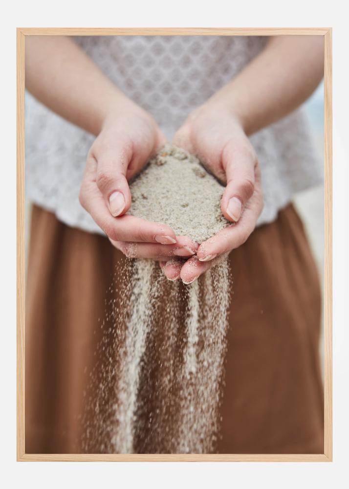 Egy puha és megnyugtató poszter, amelyen egy lány homokot tart a kezében. A finom homok átszitál az ujjai között. A finoman színezett ruhákba öltözve nagyon megnyugtató képet adnak. Egy békés és pihentető fotó, amely tökéletesen illene egy bézs falra bármelyik szobájában az otthonában.