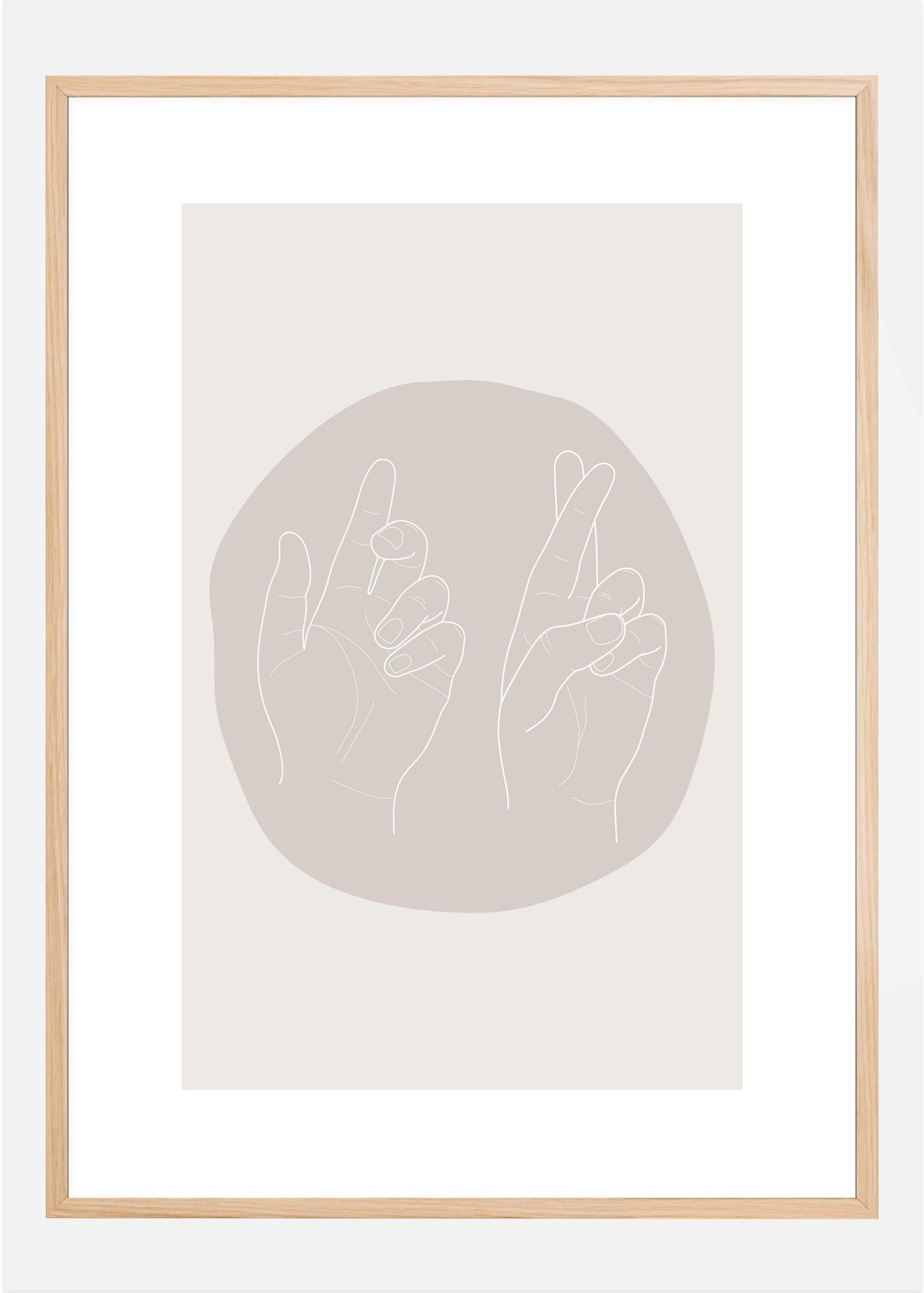 Egy egyszerű poszter két bal kézről, kör alakú bézs formával. A kört egy testszínű háttérre helyezték, mindkét kéz a poszter felső széle felé mutat. A kezek nyugodtak, és egy békés atmoszférát teremtenek az otthonodban. Tökéletes kép a dolgozószobád számára.