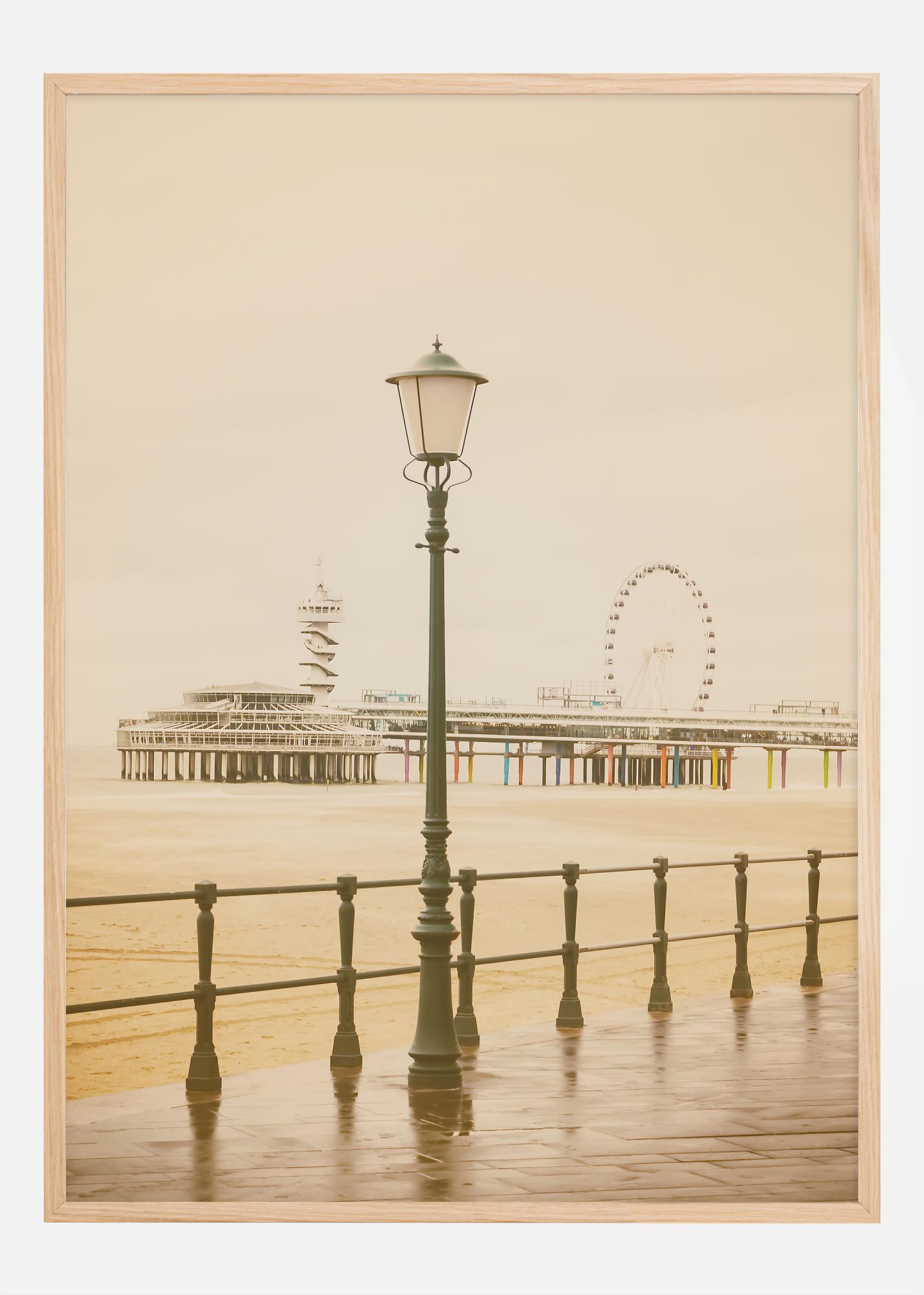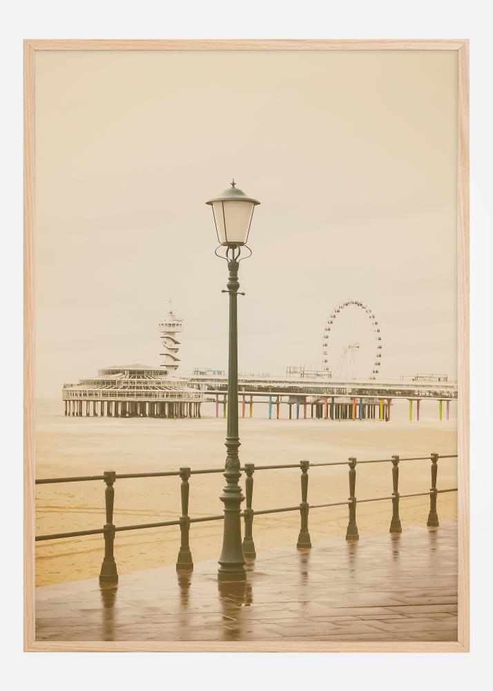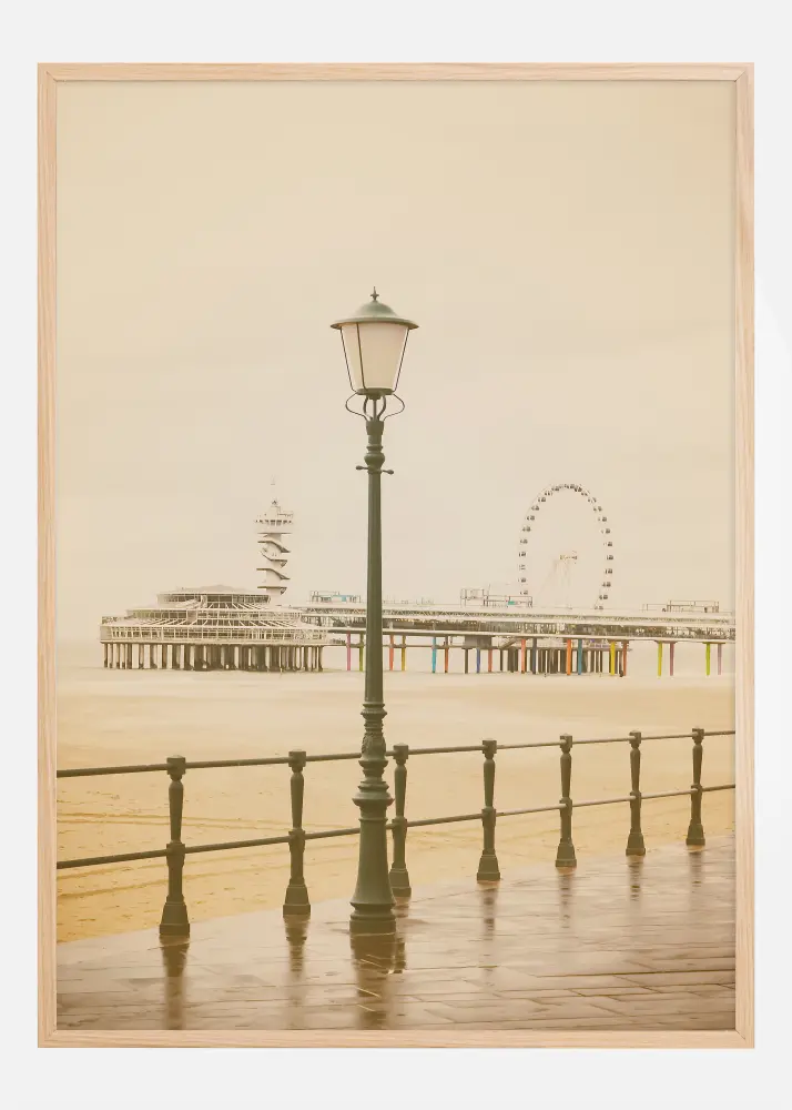 Ez a nosztalgikus poszter a lassú, álmodozó nap érzését idézi a tengernél. Egy régimódi lámpás áll az előtérben, csendes őrzőként az üres sétány klasszikus korlátja felett. A háttérben egy móló látható kilátótoronnyal és egy nagy óriáskerékkel, amely időtlen vidámparkromantikát kölcsönöz a képnek. A lágy szépia- és bézs tónusok fokozzák a letűnt kor érzését, és elgondolkodásra hívnak.