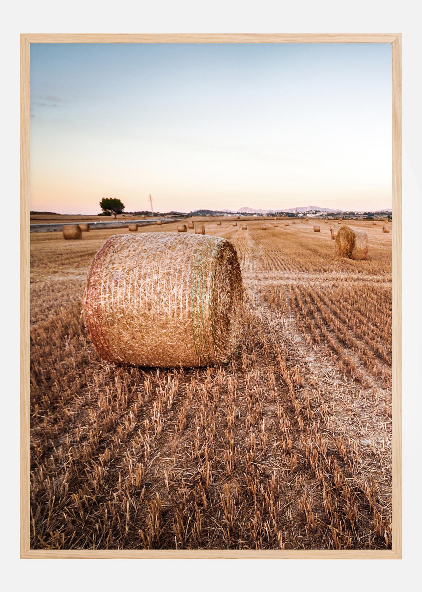 Egy egyszerű, de gyönyörű természetposzter. Az előtérben lévő szénabála szépen fel van tekerve, míg a távolban más tekert szénabálák szétszórva találhatóak a mezőkön. A világoskék égbolt és a meleg barna színek egy meleg és pihentető képet alkotnak, amely felakasztható egy vidéki konyhában.