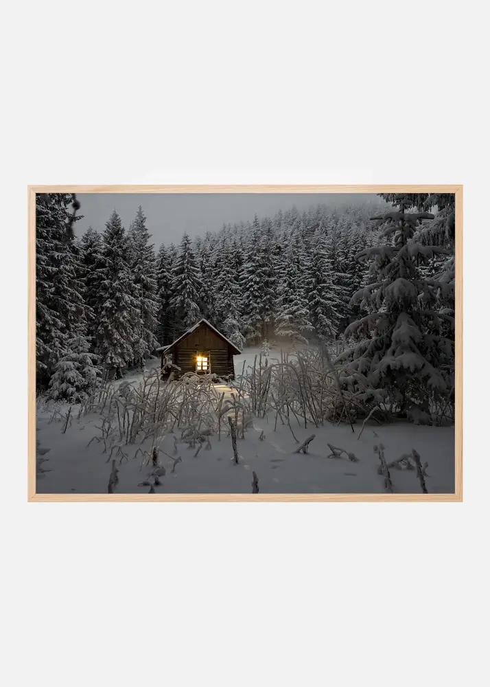 Poszter egy aranyos kis rönkházzal téli köntösben, mélyen a fenyőerdőben. Az ablaktól érkező fény, amely megvilágítja a fagyos téli éjszakát, mélységet ad a fényképnek és érdekessé teszi a képet. A kép minden belsőépítészeti stílushoz és környezethez illik. Ugyanolyan szép egy vékony fekete fémkeretben, mint egy masszívabb fa változatban, vagy miért ne emelhetnénk ki a képet egy klasszikus aranykeretben.