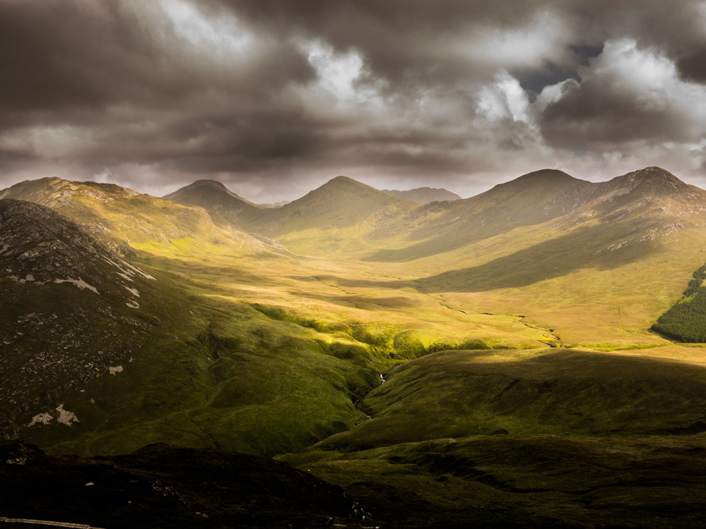 Dramatikus tájképi portré viharos felhőkkel, amelyek egy hegylánc fölé tornyosulnak, miközben a nap megvilágítja az alant fekvő völgyet. Tompa, visszafogott színek hangsúlyozzák a kép drámáját, és valóban kiemelik a fényképet. Legjobban olyan keretben mutat, amely kiemeli a kép mélységét, és nem vonja el a figyelmet a témáról.