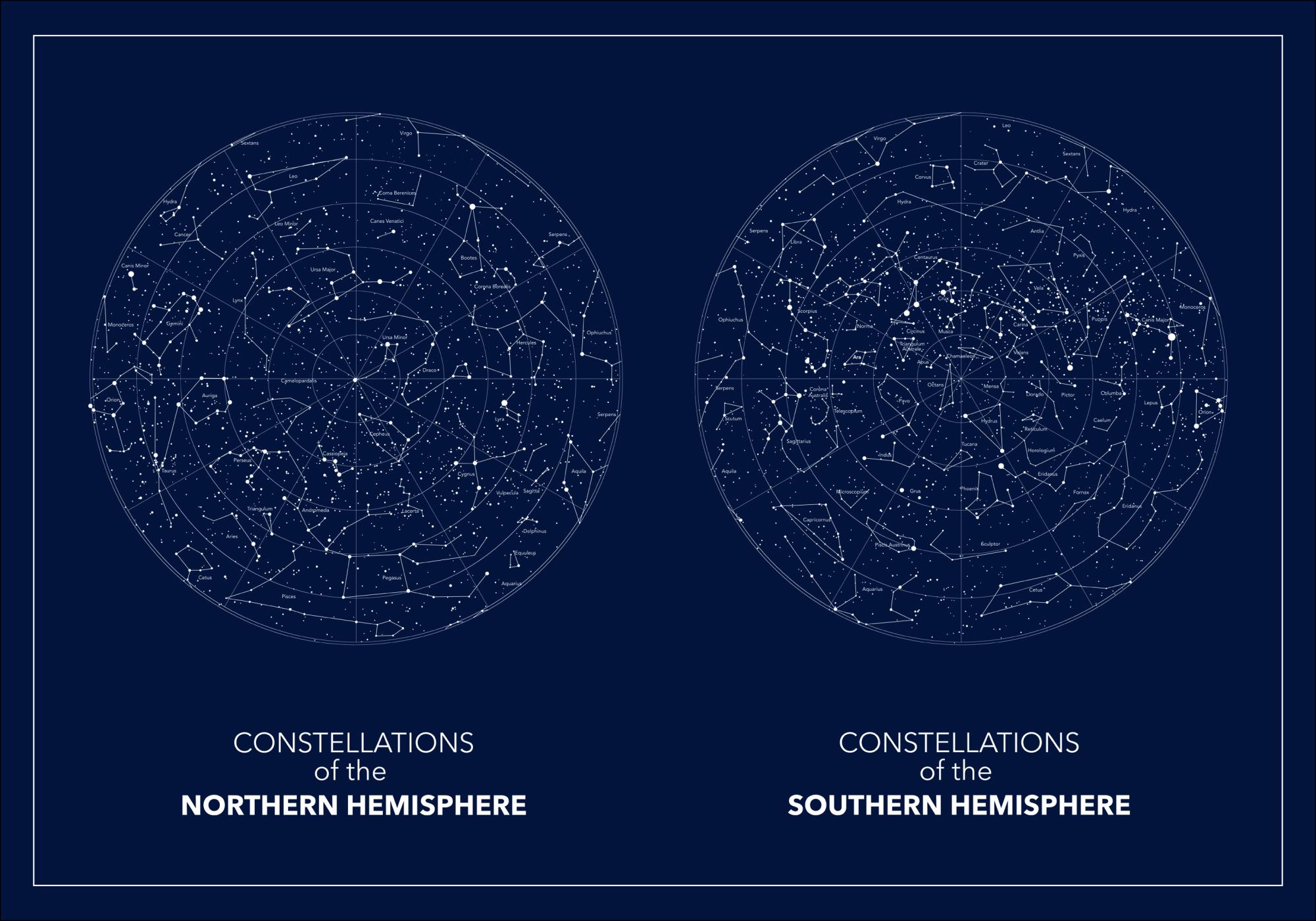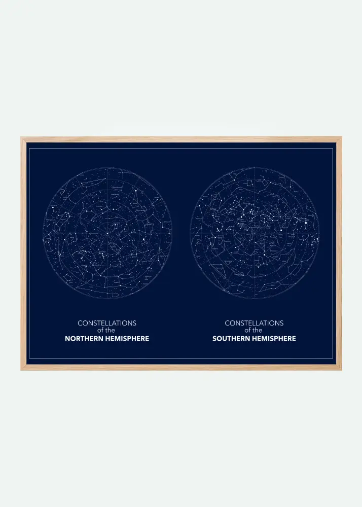 Egy lenyűgöző sötétkék poszter az északi és déli csillagos égbolttal. Mindkét kép egymás mellett van elhelyezve. A sötétkék háttéren fehéren halványan körvonalazott csillagképek láthatók. Akaszd ki ezt a képet a dolgozószobádba, hogy a végtelenség érzését keltse.