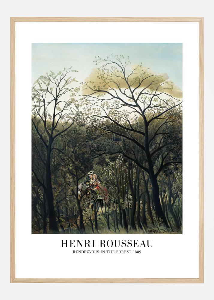 Ez a lenyűgöző plakát, amely 'Randevú az erdőben' címmel 1889-ből származik, Henri Rousseau műve, amely megragad egy titkos találkozót a buja erdőben. Tökéletes választás annak, aki egy olyan művészi nyomatot keres, amely egyszerre klasszikus és titokzatos. A kép egy különös jelenetet ábrázol, ahol egy piros ruhás alak mintha eggyé válna a környező növényzettel. Az alkotás fő színei egy zöld szimfóniát alkotnak, amelyek a mély mohazöldtől a lágy, halvány tónusokig terjednek, amelyek kiegészítik egymást, és mélységet és dimenziót adnak az erdei környezetnek. A bézs és kék levegős árnyalatai megnyitják az eget, és egy széles tájról szóló benyomást keltenek, amely békés és hívogató egyszerre.