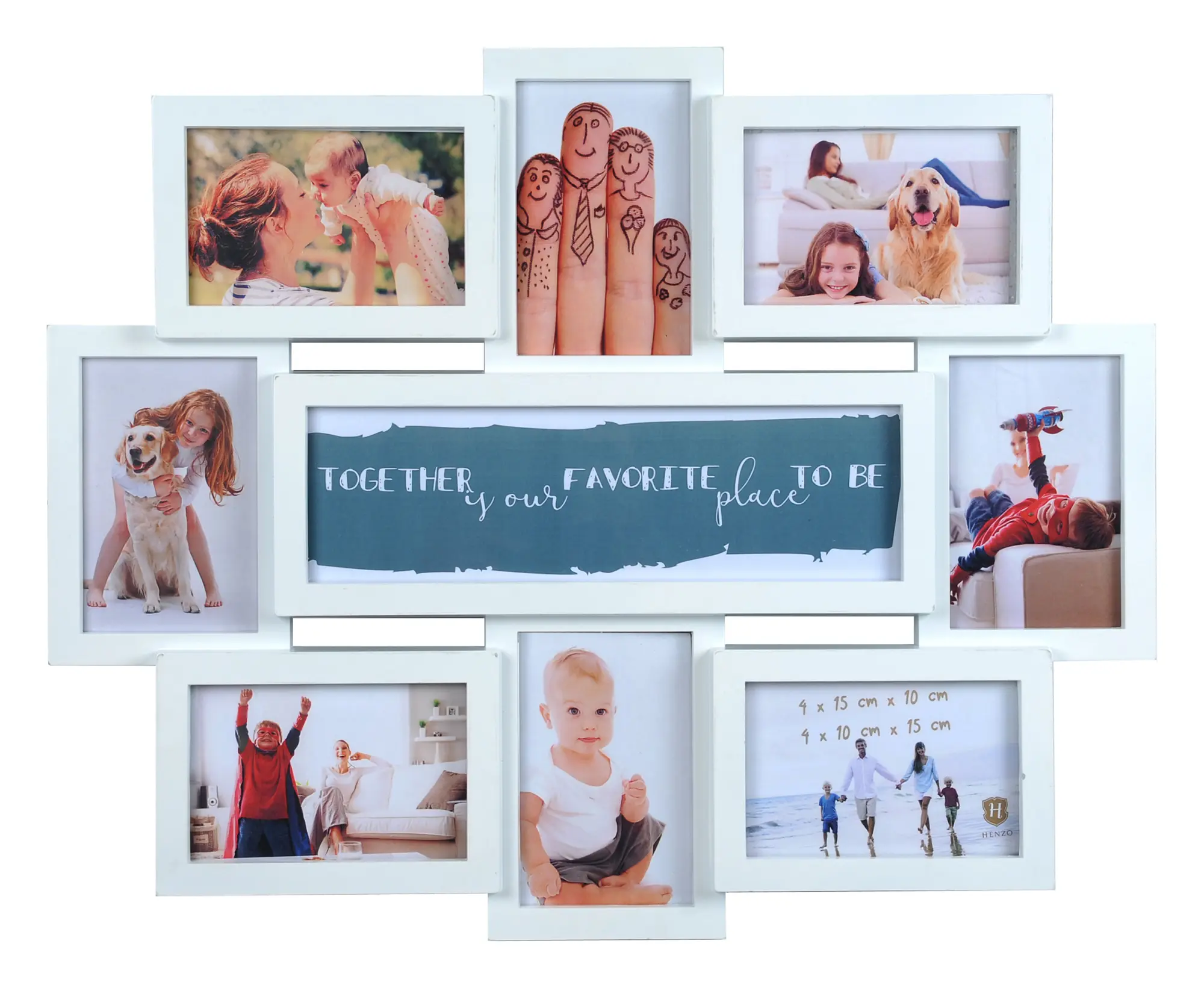 Gyűjtsd össze a legszebb fényképeidet egy elegáns kollázskerettel! Ez a keret nem csak kellemes a szemnek, hanem újra is tervezheted! Ugyanis 5 darab aranyos, különböző témájú szöveg tartozik hozzá, amelyeket a középső (9.) keretbe helyezhetsz el, és kicserélheted, amikor csak kedved tartja. Például elhelyezhetsz olyan szövegeket, mint "Csak a szerelemre van szükséged" vagy "Mondd igent a családra". A kollázskeret fekete és fehér színekben kapható.