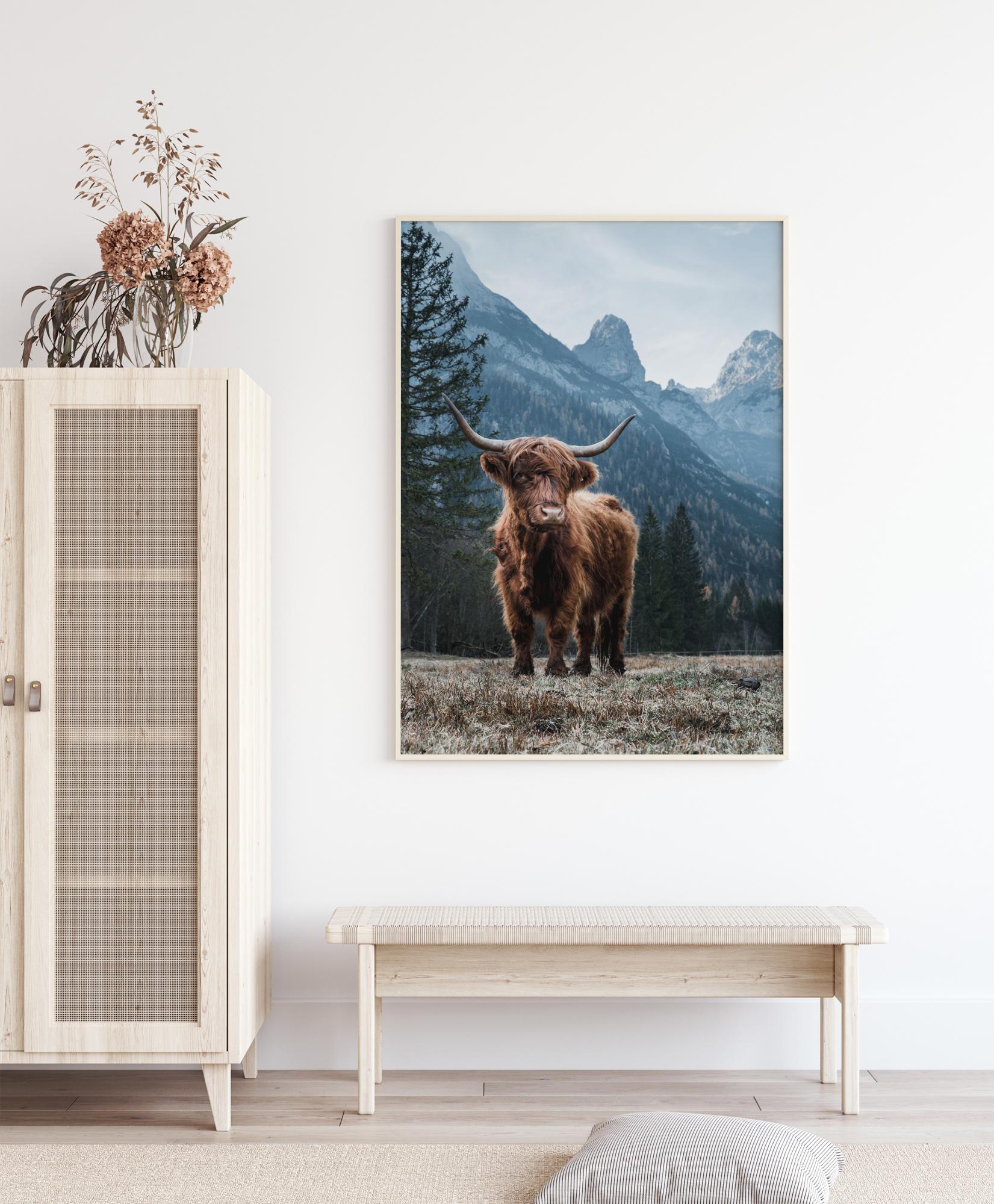 Egy vad poszter egy vörösesbarna felföldi tehénről, amely egyedül áll egy mezőn. A hóval borított meredek hegyek bekeretezik ezt a gyönyörű állatot. Rövid, bozontos szőrével, amely átviseli a zord körülményeket, az állatot látszólag semmi sem zavarja. Használd a fantáziád, és képzeld el, hogy a skót felföldeken vagy.